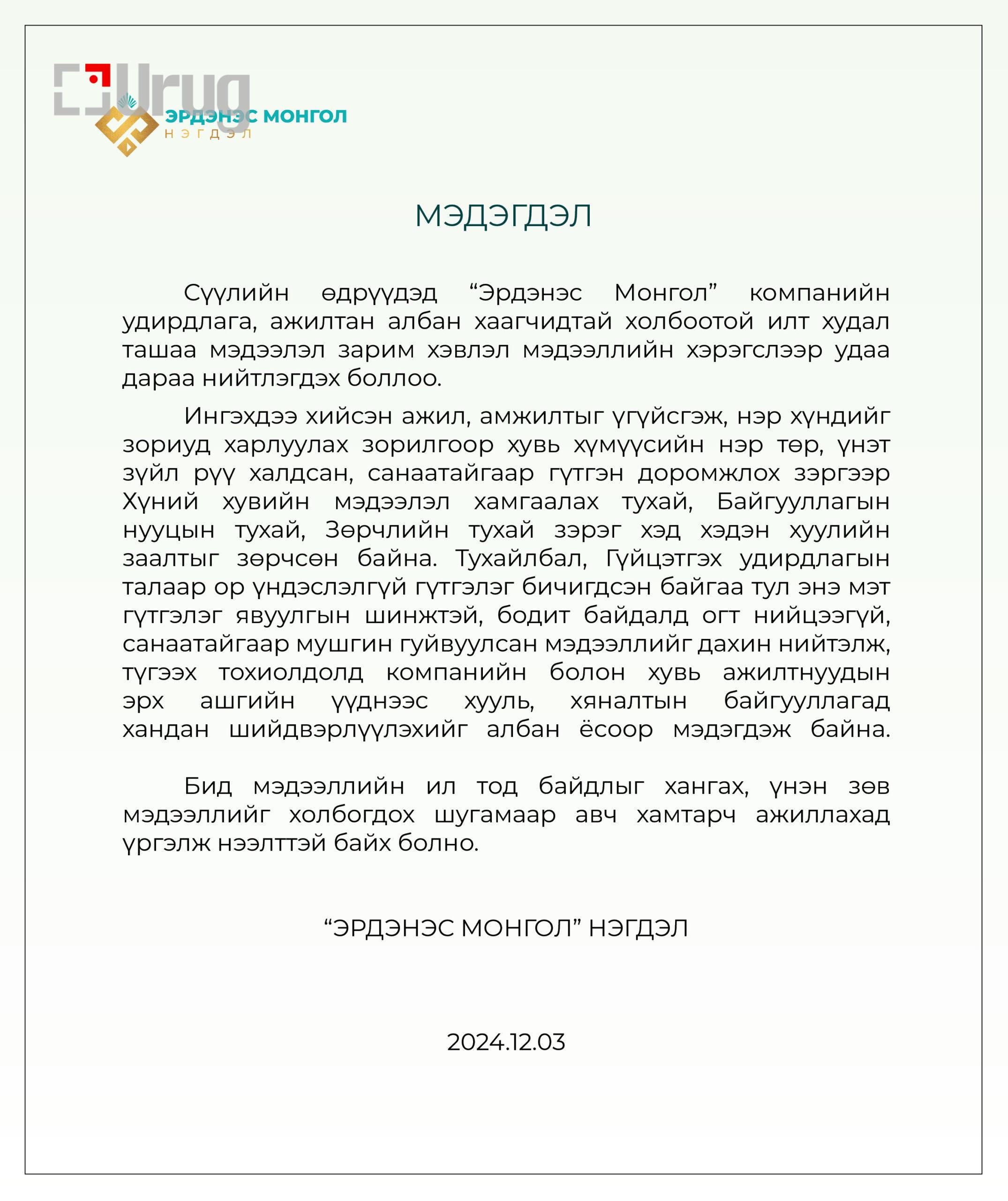 Эрдэнэс Монгол ХХК-аас мэдэгдэл гаргалаа