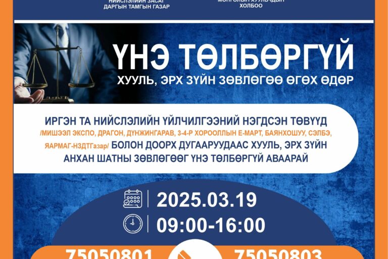 Энэ сарын 19-нд хууль зүйн зөвлөгөө үнэгүй өгөх өдөрлөг болно