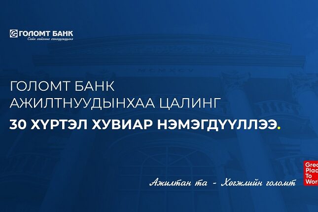 ГОЛОМТ БАНК АЖИЛТНУУДЫНХАА ЦАЛИНГ 30 ХҮРТЭЛ ХУВИАР НЭМЭГДҮҮЛЛЭЭ