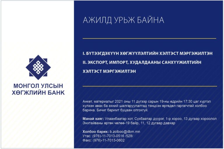 МОНГОЛ УЛСЫН ХӨГЖЛИЙН БАНКАНД АЖИЛЛАХЫГ УРЬЖ БАЙНА