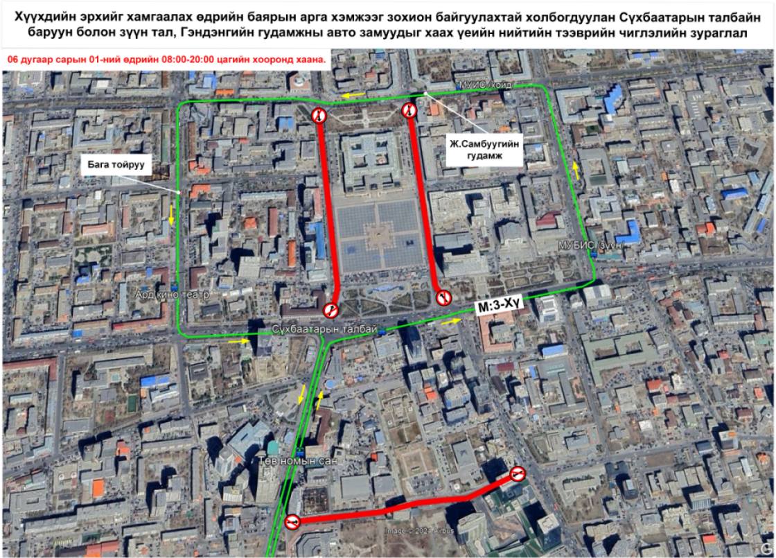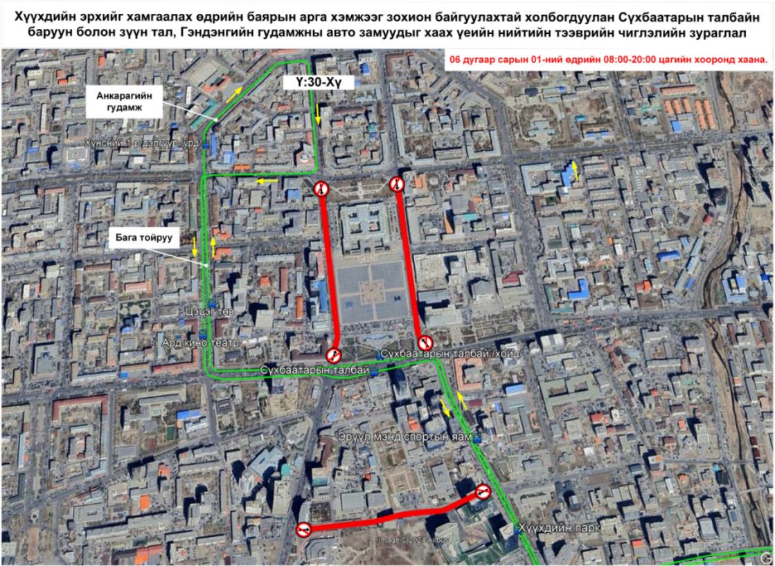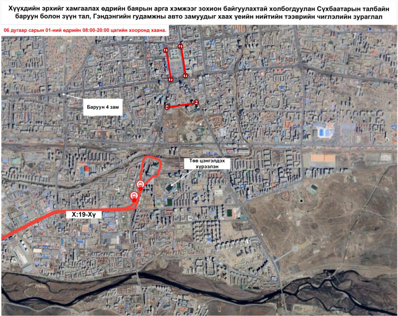 Олон улсын хүүхдийн эрхийг хамгаалах өдрийн баярын арга хэмжээний үеэр зарим гудамж замыг хааж байгаатай холбогдуулан 06:00-20:00 цагийн хооронд доорх зураглалын дагуу үйлчилгээ үзүүлнэ.