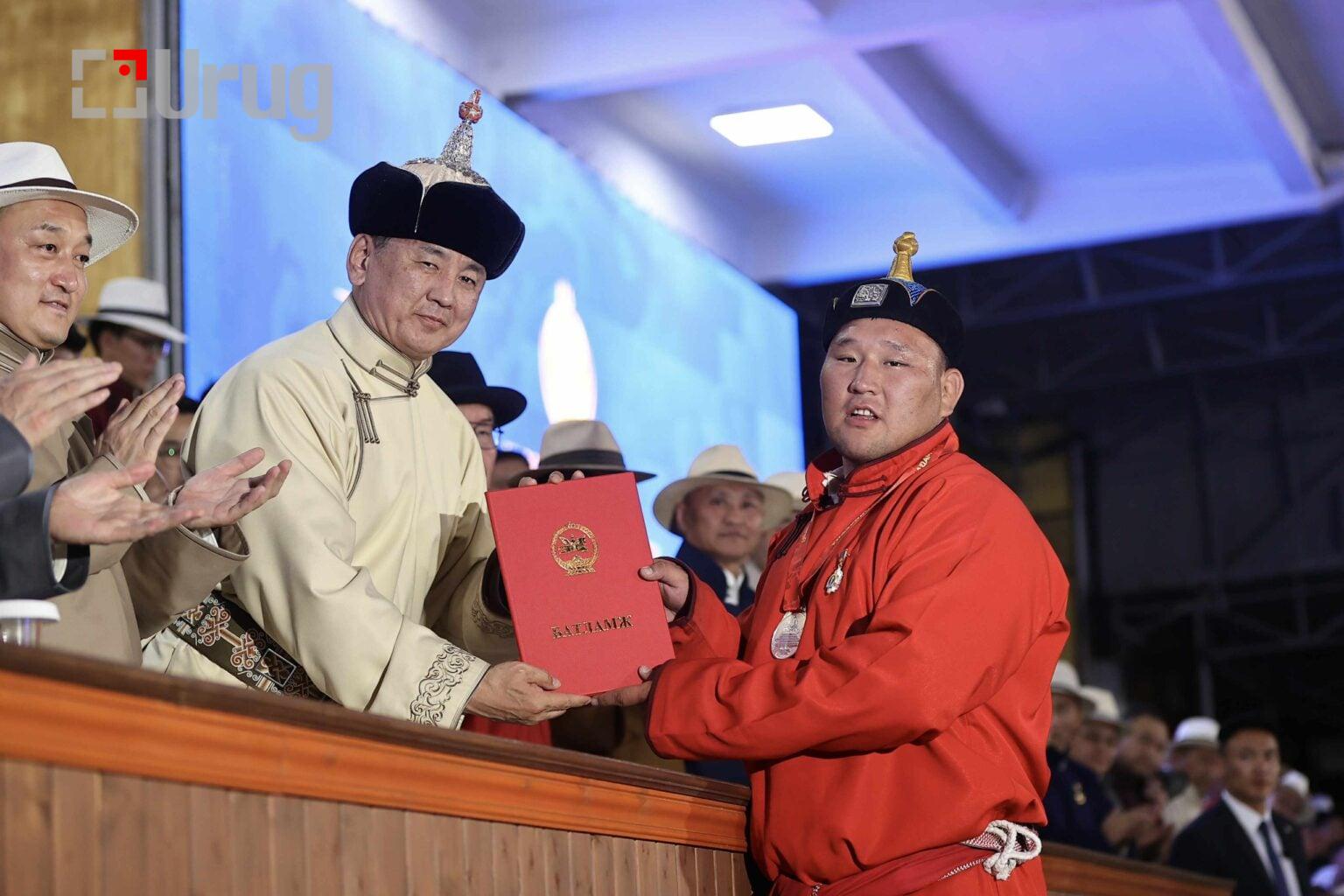 Монгол Улсын Ерөнхийлөгч Ухнаагийн Хүрэлсүх зарлиг гаргаж, Тулгар төрийн 2234 жил, Их Монгол Улс байгуулагдсаны 819 жил, Үндэсний эрх чөлөө, тусгаар тогтнолоо сэргээн мандуулсны 114 жил, Ардын хувьсгалын 104 жил, Ардчилсан хувьсгалын 35 жилийн ой, Улсын баяр наадмын Үндэсний бөхийн барилдаанд ес давж түрүүлсэн Баянхонгор аймгийн Жинст сумын харьяат, “Алдар” спорт хороо, “Тэргүүн Богд” дэвжээний бөх, Улсын начин Энхтүвшингийн Батмагнайд “Улсын арслан” цол олголоо.