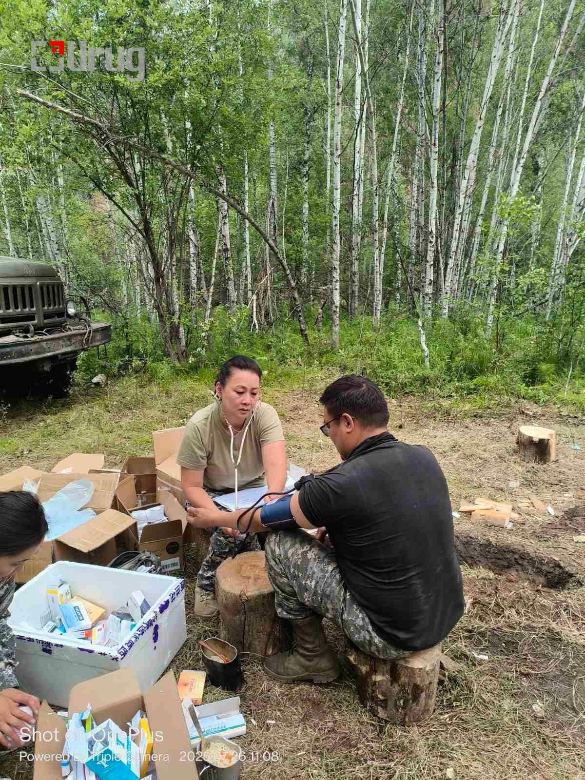 Сэлэнгэ аймгийн Мандал, Ерөө, Хүдэр суманд гарсан ойн түймрийг унтраахаар ажиллаж байгаа алба хаагчдад эрүүл мэндийн тусламж үйлчилгээг газар дээр нь үзүүлж байна.