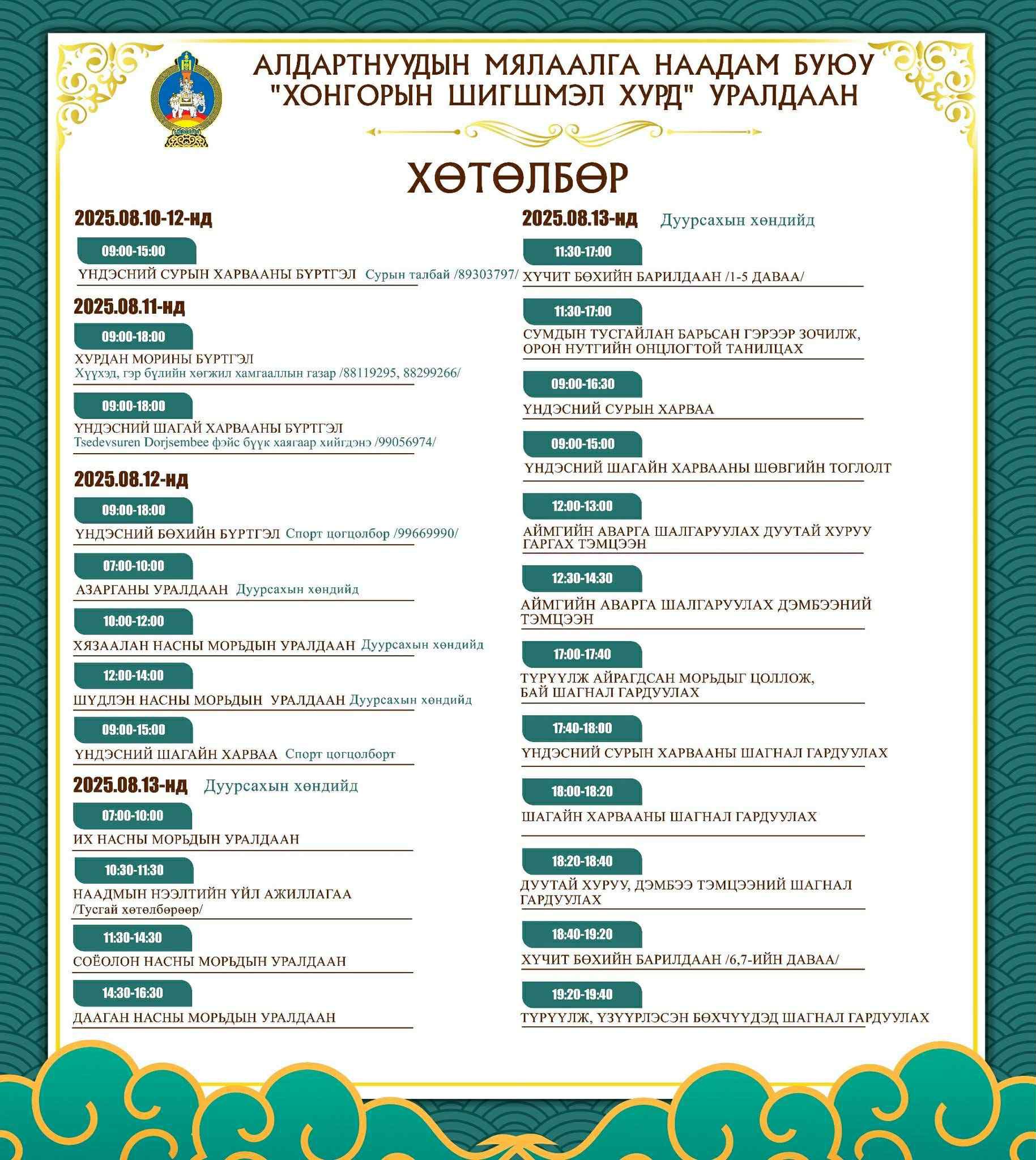 Баяр наадмын хүрээнд зургаан насны морины уралдаан, хүчит бөхийн барилдаан, сур, шагайн харваа эрийн гурван наадам зохион байгуулагдана.