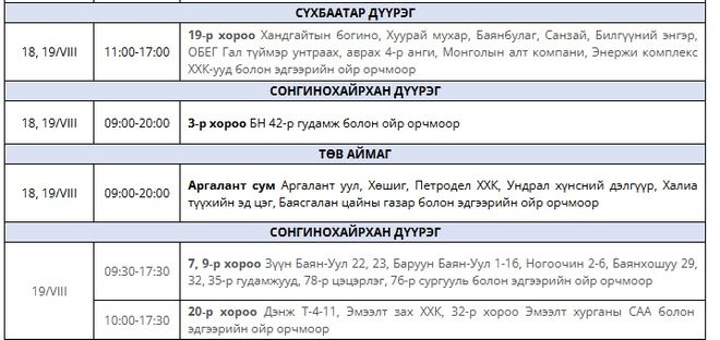 Сүхбаатар дүүргийн 19-р хороо Хандгайтын богино, Хуурай мухар, Баянбулаг, Санзай, Билгүүний энгэр, ОБЕГ гал түймэр унтраах аврах 4-р анги, “Монголын алт” компани, “Энержи комплекс” ХХК-иуд болон эдгээрийн ойр орчимд өнөөдөр цахилгаан 11:00-17:00 цагийн хооронд хязгаарлана.