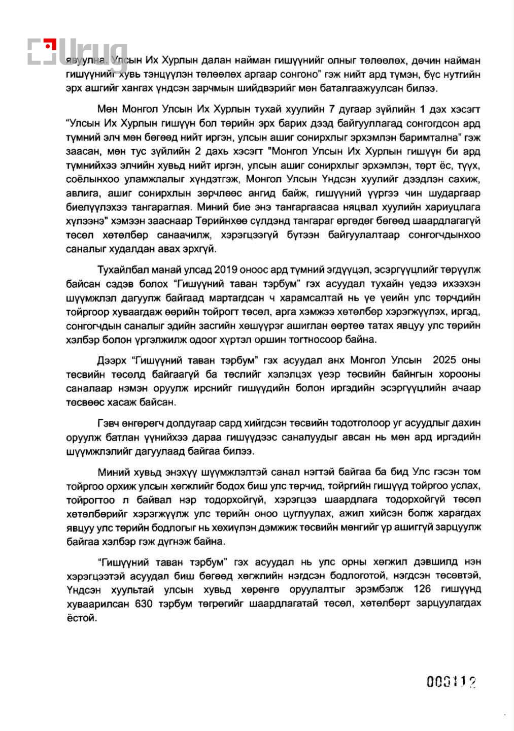 Тус албан ичигт “Манай улсад 2019 оноос ард түмний эгдүүцэл, эсэргүүцлийг төрүүлж байсан сэдэв болох “Гишүүний таван тэрбум” гэх асуудал тухайн үедээ ихээхэн шүүмжлэл дагуулж байгаад мартагдсан ч харамсалтай нь үе үеийн улс төрчдийн тойргоор хуваагдаж өөрийн тойрогт төсөл, арга хэмжээ хөтөлбөр хэрэгжүүлэх, иргэд, сонгогчдын саналыг эдийн засгийн хөшүүрэг ашиглан өөртөө татах явцуу улс төрийн хэлбэр болон үргэлжилж одоог хүртэл оршин тогтносоор байна.