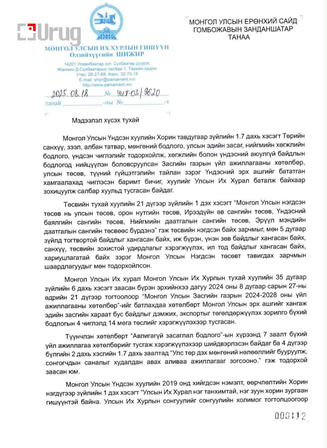 Цаашилбал энэ нь Монгол Улсын Их Хурлын гишүүдийн саналыг багцлах, Засгийн газрын үйл ажиллагаанд тавих хяналтыг бүрэн эрхэд халдаж байгаа улс төрийн үйл ажиллагаа гэж хардах үндэслэлтэй байна. Иймээс дээрх асуудлуудын хүрээнд Монгол Улсын Их хурлын тухай хуулийн 8 дугаар зүйлийн 8.1.16, 37 дугаар зүйлийн 37.1.5 дахь хэсэгт заасны дагуу дараах мэдээллийг хуулийн хугацаанд ирүүлэхийг танаас хүсье. Үүнд: