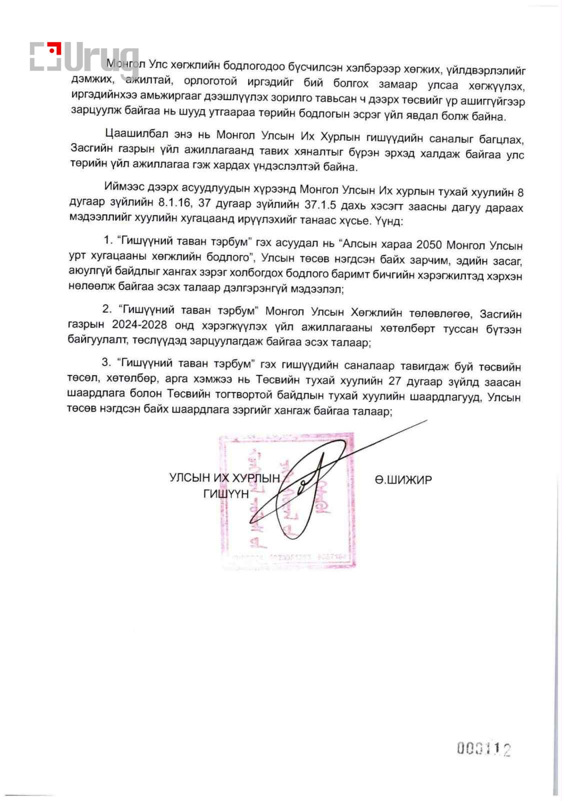 Монгол Улсын Их хурлын гишүүн Ө. Шижир “Гишүүний таван тэрбум” гэх асуудал нь Монгол Улсын Их Хурлын гишүүдийн саналыг багцлах, Засгийн газрын үйл ажиллагаанд тавих хяналтыг бүрэн эрхэд халдаж байгаа улс төрийн үйл ажиллагаа гэж хардах үндэслэлтэй байгаа тул энэхүү асуудлын талаар мэдээлэл авахаар өнгөрсөн тав дахь өдөр буюу / 2025.08.15 /-ны өдөр Монгол улсын ерөнхий сайд Г.Занданшатарт албан бичиг хүргүүллээ.