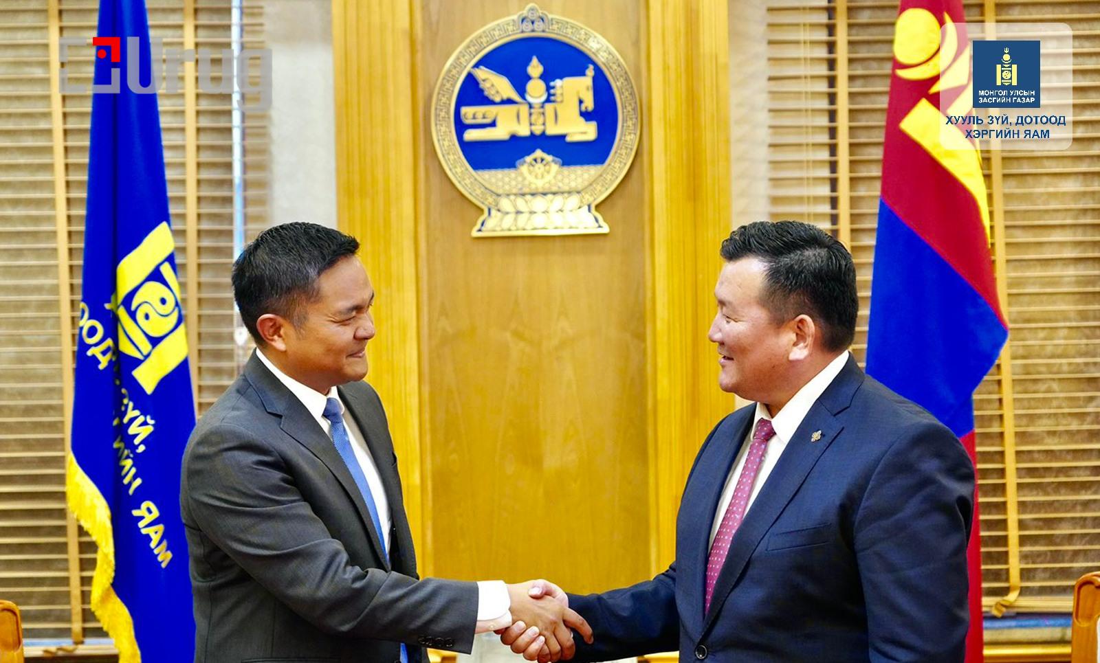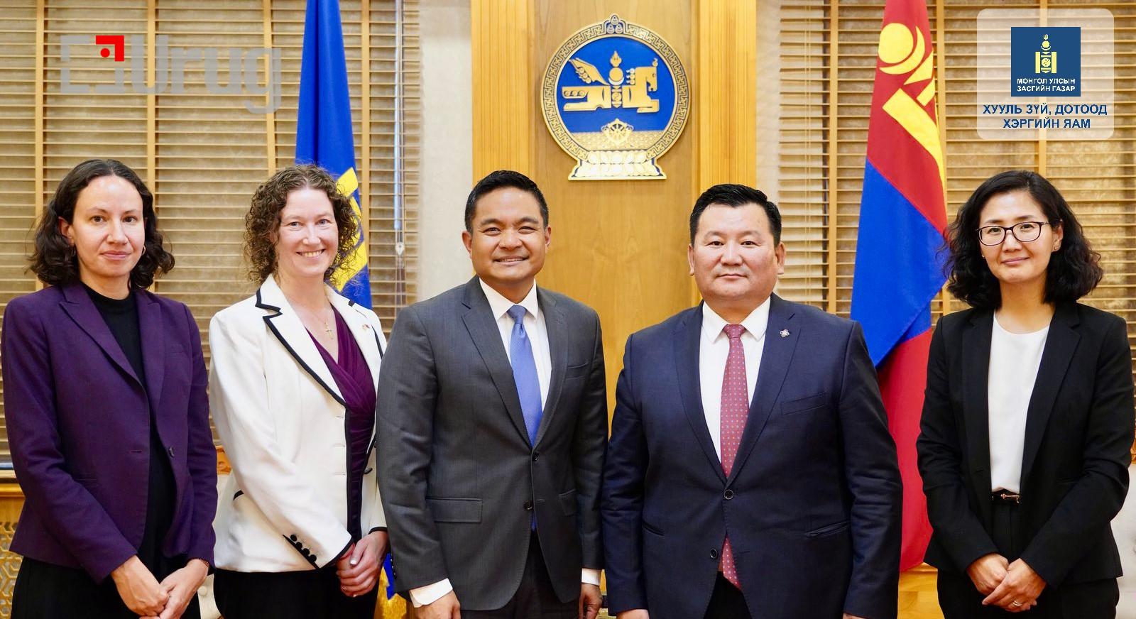 Хууль зүй, дотоод хэргийн сайдын хувьд “Эрх зүйн шинэтгэл 2.0” хийж Монгол Улсад мөрдөгдөж буй хуулиудын хүний эрхийг хангасан байдлыг үнэлэн, холбогдох хуулиудад өөрчлөлт оруулахаар ажиллаж байна. Мөн “Эдийн засгийг эрх зүйгээр дэмжих” хөтөлбөрийн хүрээнд хөрөнгө оруулагчдыг дэмжих, хамгаалах чиглэлд хуулинд өөрчлөлт оруулахаар ажиллаж байгаа бөгөөд энэ талаараа элчин сайд Ричард Баунгантай ярилцлаа. Цаашид үндэстэн дамнасан зохион байгуулалттай гэмт хэрэг, хар тамхи мансууруулах бодис, сэтгэцэд нөлөөлөх эм бэлдмэлтэй холбоотой эрсдэлийг бууруулах чиглэлд хууль тогтоомжийн хэрэгжилтийг хангах, урьдчилан сэргийлэх, тэмцэх, илрүүлэх чиглэлд АНУ-ын хууль хяналтын байгууллагуудтай хамтын ажиллагаагаа өргөжүүлэх, албан хаагчдын мэргэжлийн ур чадварыг нэмэгдүүлэх, дэвшилтэт техник технологи, тоног төхөөрөмжийн дэмжлэг үзүүлэх хөтөлбөрүүдийг хамтран хэрэгжүүлэх хүсэлтэй байгаагаа илэрхийллээ.