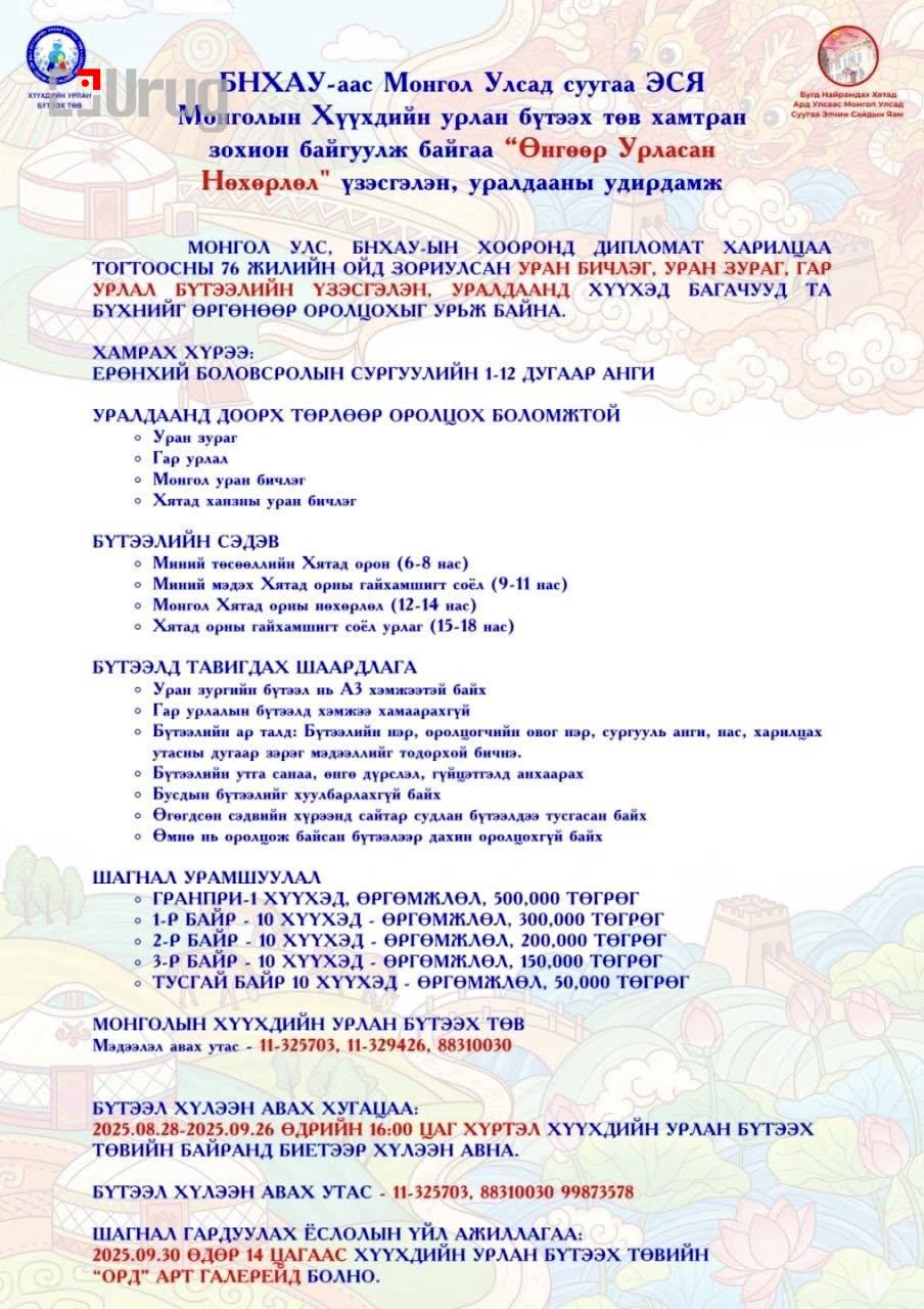 Шагнал гардуулах ёслолын үйл ажиллагаа 2025.09.30-ны өдөр 14 цагаас Хүүхдийн урлан бүтээх төвийн “Орд” арт галерейд болно.