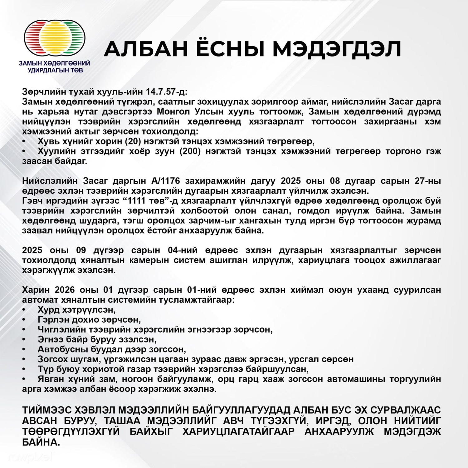 Үүнтэй холбоотойгоор Замын хөдөлгөөний удирдлагын төв /ЗХУТ/-өөс албан ёсны мэдэгдэл гаргалаа.