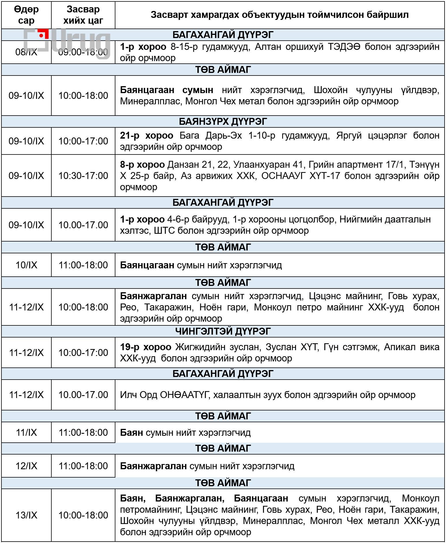 Цаг агаарын нөхцөл байдлаас шалтгаалан хуваарьт өөрчлөлт орвол, гэрээт бүртгэлтэй утасны дугаарт мэдээлэл хүргэх болно. Засварын ажлыг тухайн тоноглолоос хүчдэлээс бүрэн чөлөөлсний дараа хийдэг нөхцөл байдлыг харгалзан үзэж, хүлээцтэй хандахыг хэрэгчлэгч та бүхнээс хүсэж байна.