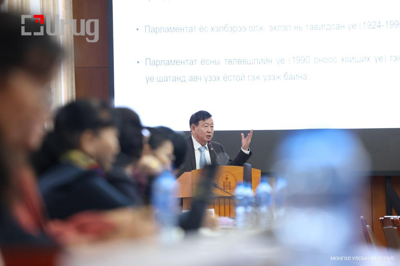 Улсын Бага Хурлын болон Улсын Их Хурлын гишүүд, эрдэмтэн, судлаачдын оролцож буй эрдэм шинжилгээний хурлын эхний илтгэлийг “Парламентын 35 жилийн сорилт, сургамж” сэдвээр Улсын Их Хурлын дарга асан Д.Лүндээжанцан танилцуулав.