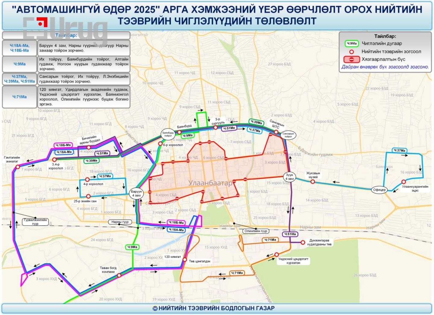 Маргааш/2025.09.13/ автомашингүй өдрөөр төв замын хөдөлгөөнийг хаах тул нийтийн тээврийн 43 чиглэлийн 459 автобусны маршрутад 07:00-18:00 цагийн хооронд дараах өөрчлөлт орно.
