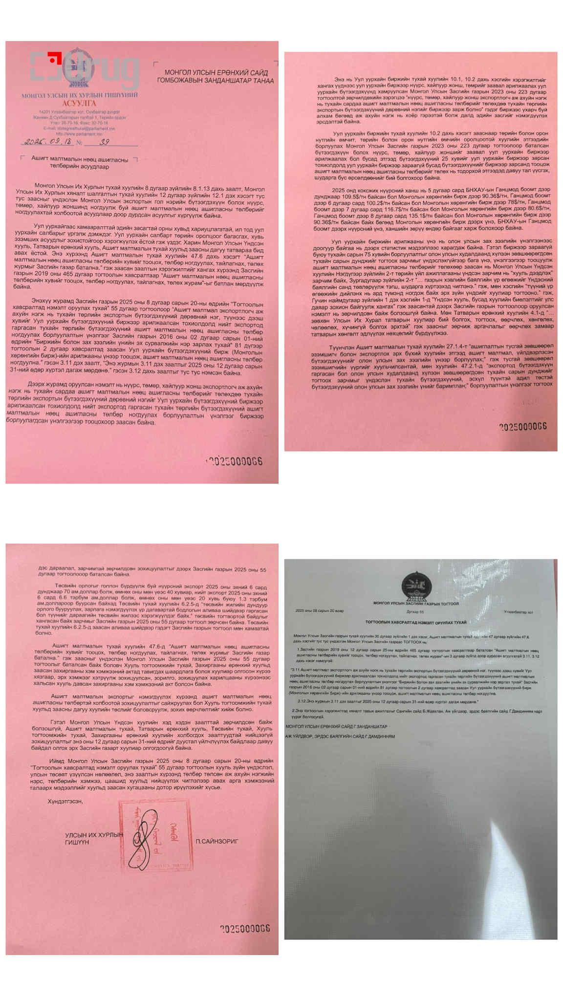 Иймд Монгол Улсын Засгийн газрын 2025 оны 8 дугаар сарын 20-ны өдрийн “Тогтоолын хавсралтад нэмэлт оруулах тухай” 55 дугаар тогтоолын хууль зүйн үндэслэл, улсын төсөвт үзүүлсэн нөлөөлөл, энэ заалтын хүрээнд төлбөр төлсөн аж ахуйн нэгжийн нэрс, төлбөрийн хэмжээ, цаашид хуульд нийцүүлэх чиглэлээр авах арга хэмжээний талаарх мэдээллийг хуульд заасан хугацааны дотор ирүүлэхийг хүсэв.