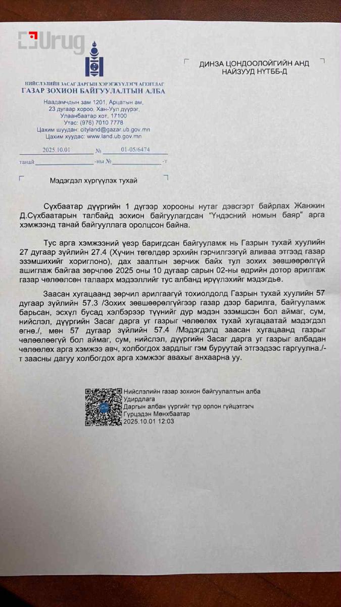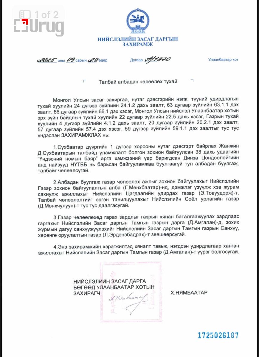 Тиймээс НЗД-ын хэрэгжүүлэгч агентлаг Газар зохион байгуулалтын албанаас Газрын тухай хуулийн 27 дугаар зүйлд заасны дагуу талбай чөлөөлөх мэдэгдлийг хүргүүлсэн. Гэсэн ч шаардлагыг биелүүлээгүй тул Монгол Улсын засаг захиргаа, нутаг дэвсгэрийн нэгж, түүний удирдлагын тухай хууль, газрын тухай хуульд үндэслэн талбай албадан чөлөөлөх Нийслэлийн засаг даргын захирамж гаргасан болно.