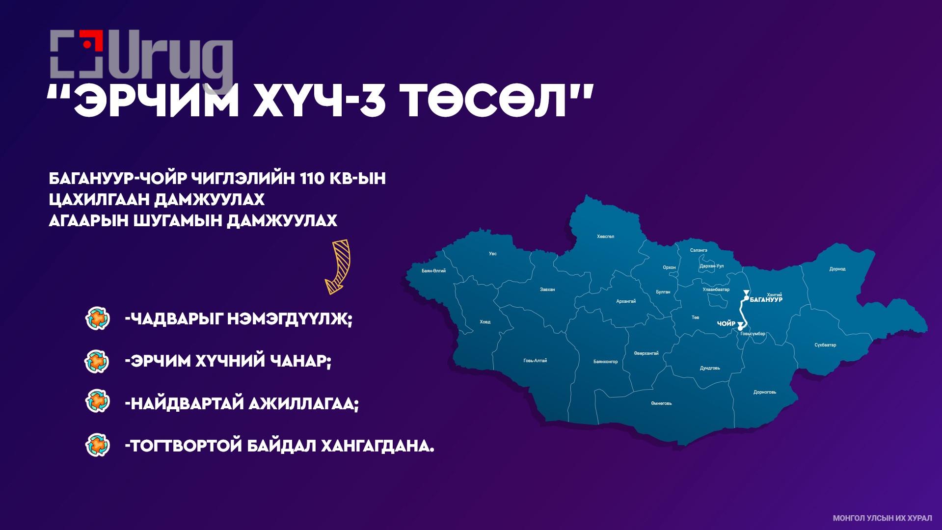 Энэ хүрээнд “Эрчим хүч-3 төсөл” буюу Багануур-Чойр чиглэлийн 188 км 220 кВ хоёр хэлхээт цахилгаан дамжуулах агаарын шугам, дэд станцыг өргөтгөхөөр болсон юм.