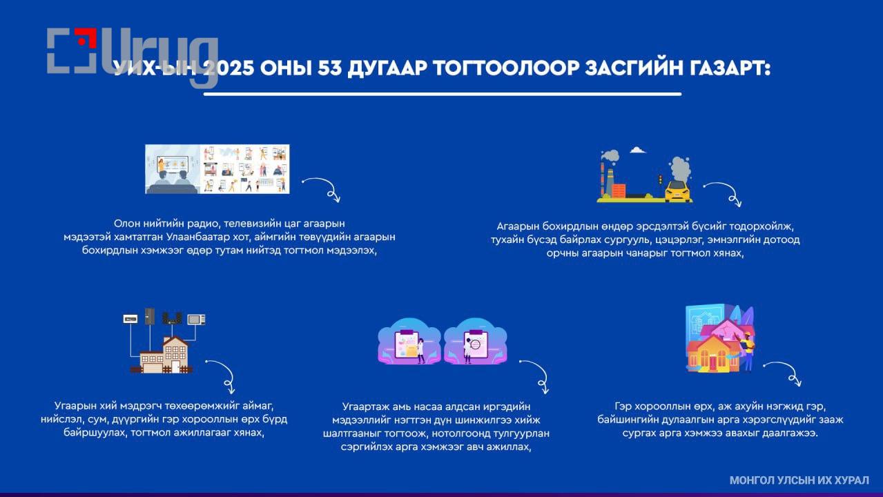 Улсын Их Хурлын 2025 оны хаврын ээлжит чуулганы 06 дугаар сарын 05-ны өдрийн хуралдаанаар “Засгийн газарт чиглэл өгөх тухай” Улсын Их Хурлын тогтоолыг баталсан.
