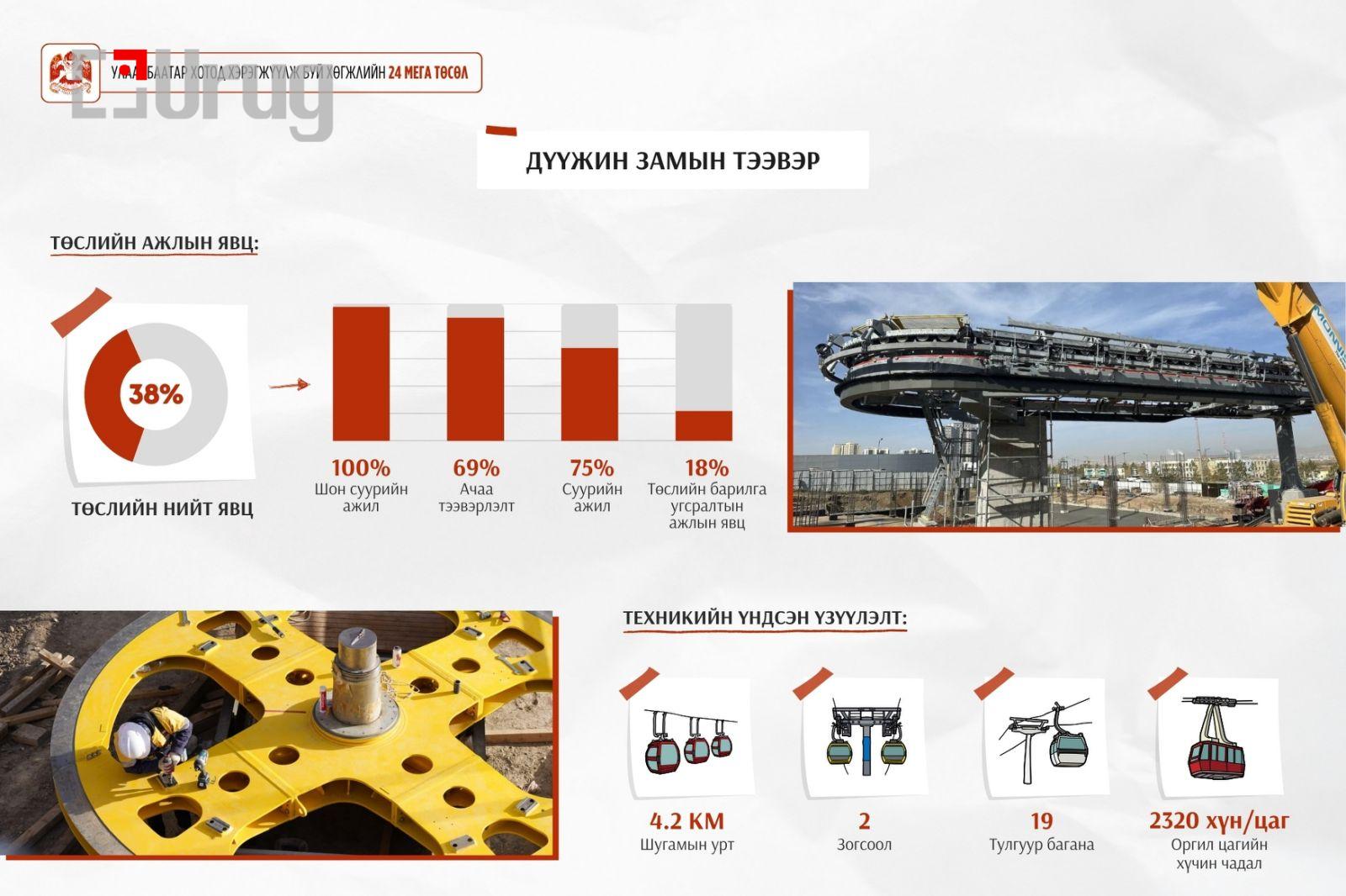 Төслийн гүйцэтгэл өнөөдрийн байдлаар 38 хувьтай байна. Нийт 19 тулгуур багана, 2 буудлын барилга баригдахаас хоёр талын буудлын барилга угсралтын ажил үргэлжилж, тулгуур багануудын шон суурийн ажил бүрэн дууссан. Тулгуур баганын суурийн ажлын явц 75 хувьтай байна. Одоогоор 19 тулгуур баганаас 6 баганыг бүрэн угсраад байгаа юм. Төслийн барилга угсралтын ажлыг Францын “Пома” групп болон “Моннис инженеринг” ХХК гүйцэтгэж байгаа бөгөөд төслийн талбайд нийт 90 гаруй хүн, 15 машин механизмтай ажиллаж байна. Барилга угсралтын ажлын гүйцэтгэл 18 хувьтай байна.