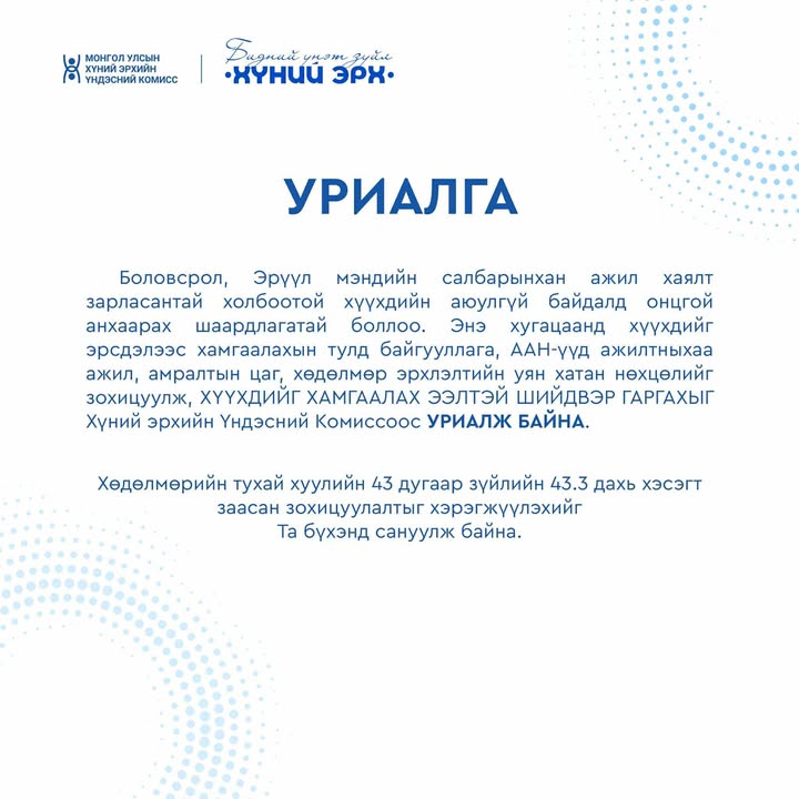 Монгол Улсын Хүний Эрхийн Үндэсний Комиссоос дараах уриалгыг гаргалаа.