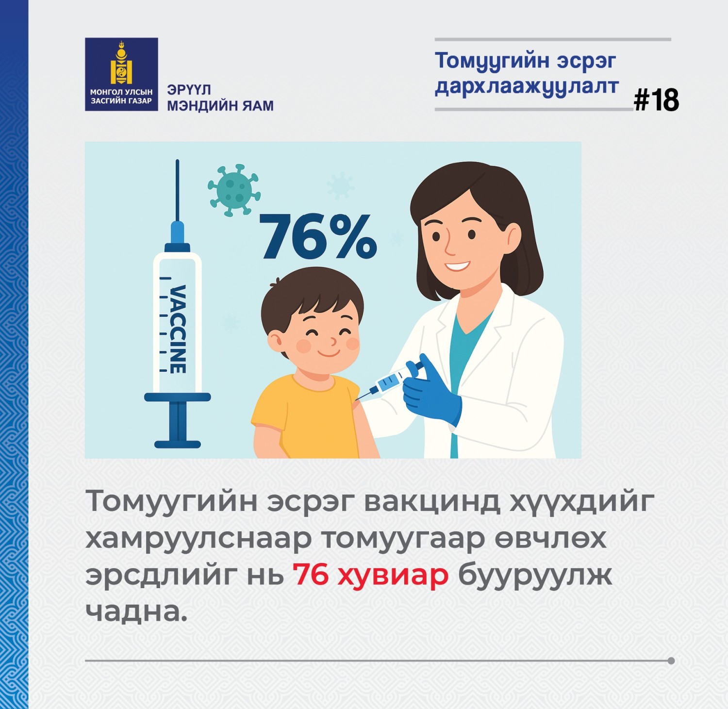 Томуугийн эсрэг вакцинд хамрагдах нь өвчлөх эрсдлийг 76 хувиар бууруулдаг болохыг ЭМЯ-аас мэдээллээ.