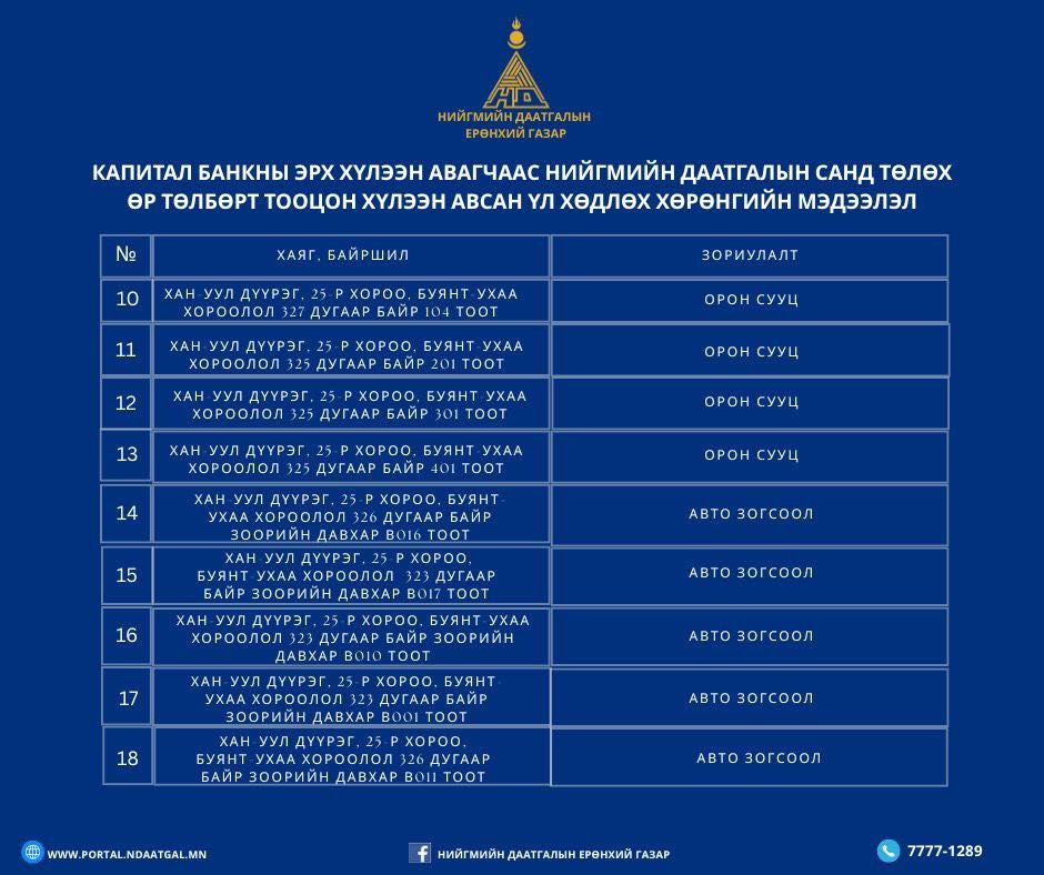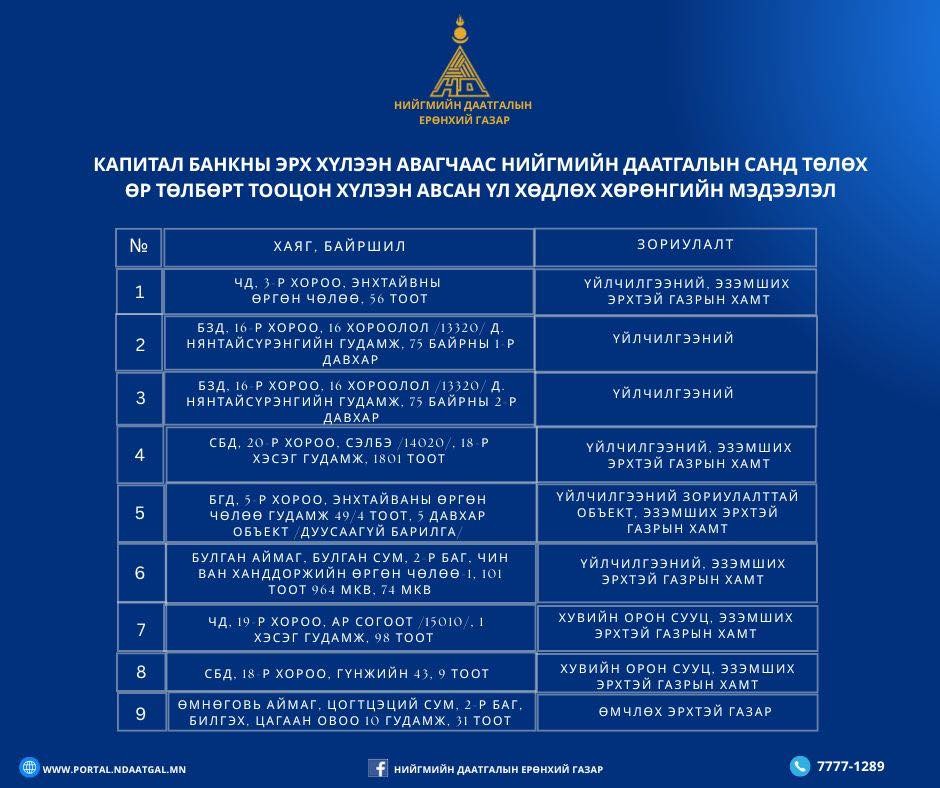 2025 онд Нийгмийн даатгалын үндэсний зөвлөлийн шийдвэрээр 1.2 тэрбум төгрөгийн үнэ бүхий 9 ширхэг үл хөдлөх хөрөнгийг өр төлбөрт тооцон, мөнгөн хөрөнгөөр 0.3 тэрбум төгрөг шилжүүлснээр нийт 1.5 тэрбум төгрөгийн өр төлбөр барагдаж Капитал банкны нийгмийн даатгалын санд төлөх өр төлбөрөөс 40.2 тэрбум төгрөгийн өр барагдаж, 64.2 тэрбум төгрөгийн үлдэгдэлтэй байна.