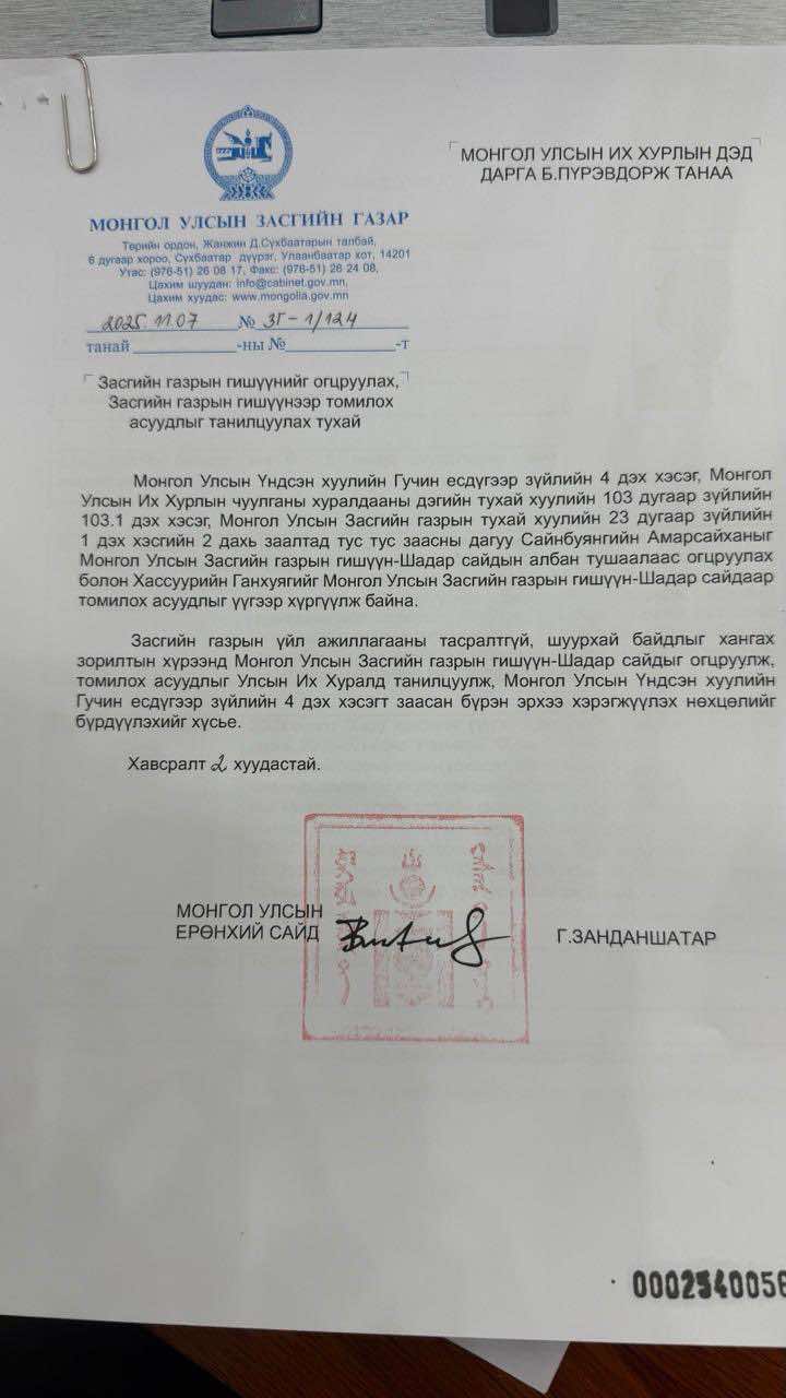 Монгол Улсын Ерөнхий сайд Г.Занданшатар Засгийн газрын гишүүн Монгол Улсын шадар сайдын албан тушаалд Улсын Их Хурлын гишүүн Х.Ганхуягийг томилох, Засгийн газрын гишүүн, Монгол Улсын шадар сайд С.Амарсайханыг сайдын албан тушаалаас нь чөлөөлөх саналыг Улсын Их Хурлын дэд дарга Б.Пүрэвдоржид хүргүүлжээ.