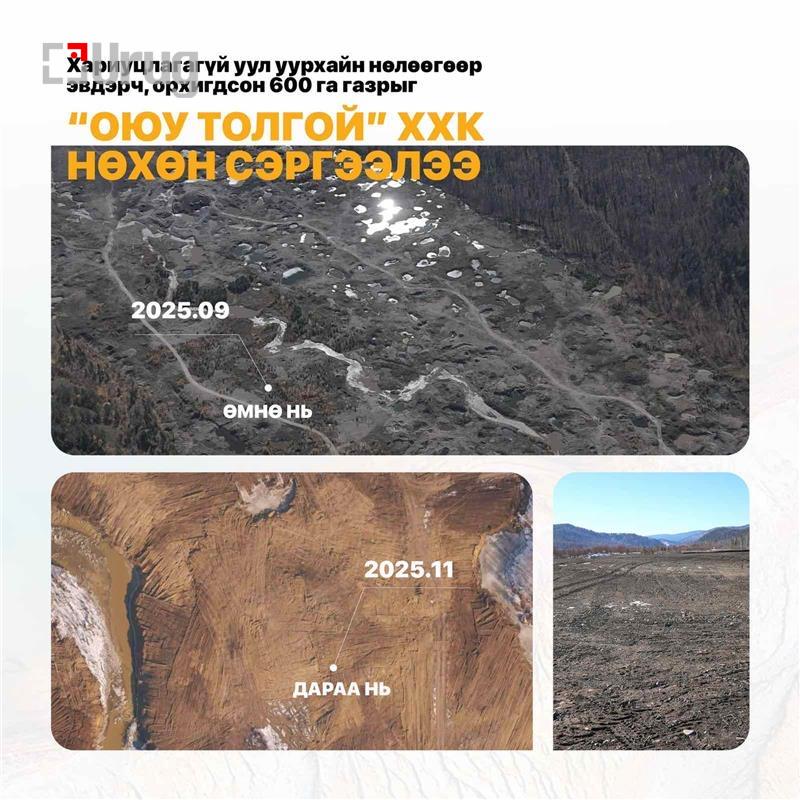 “Оюу толгой” компани өмнө нь Сэлэнгэ аймгийн Ерөө сумын Ялбагийн хөндийд 400 га талбайг, Дархан-Уул аймгийн Шарын гол сумын нутагт эвдэрч, орхигдсон орсон 215 га талбайг тус тус нөхөн сэргээсэн юм.