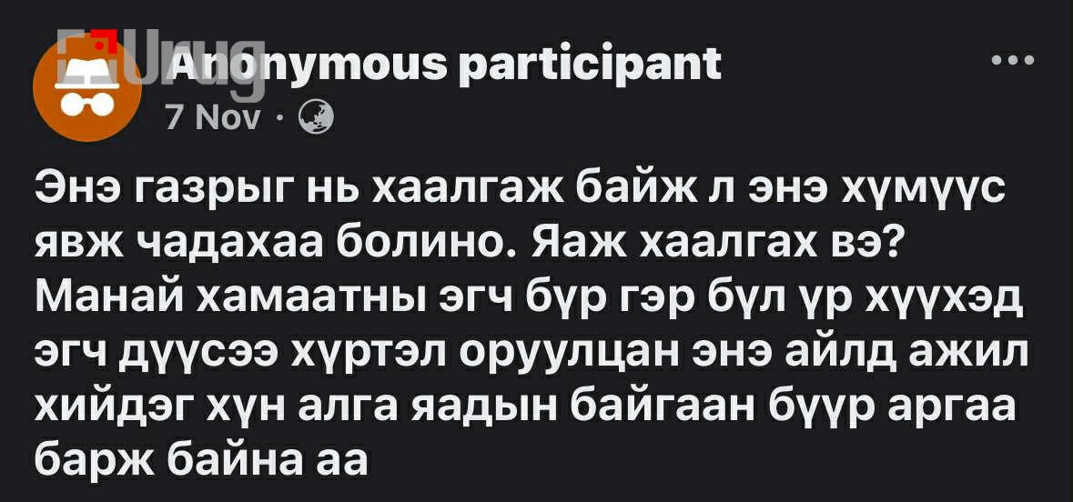 Зөвхөн би ч биш олон гэр бүл ийм асуудалтай байгаа. Энэ шашны хамгийн муухай нь ар гэрт нь асуудал үүсэхэд өөрийн хүнээ л авъя гэдэг би утсаар ярьж байхыг нь сонссон”
