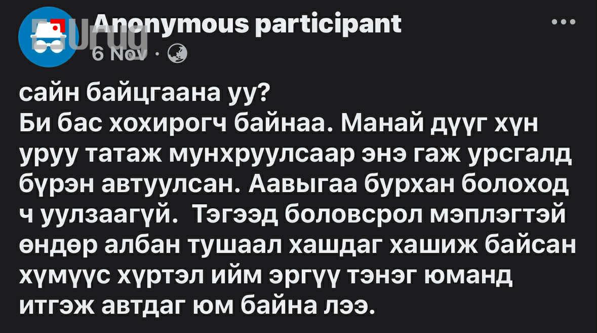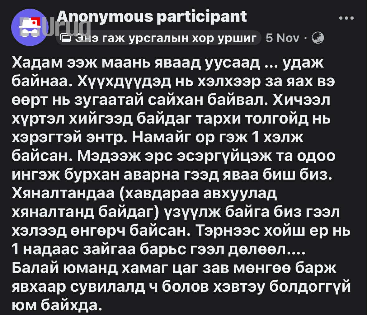 Санхүү мөнгөнийх нь хувьд тусдаа байсан болохоор нарийн сайн мэдэхгүй ч өглөө гэрээс гарахдаа хоол, цай хийгээд аваад гардаг байсан. Дороо элсүүлж байгаа хүмүүстээ л өгдөг юм шиг байгаа юм”