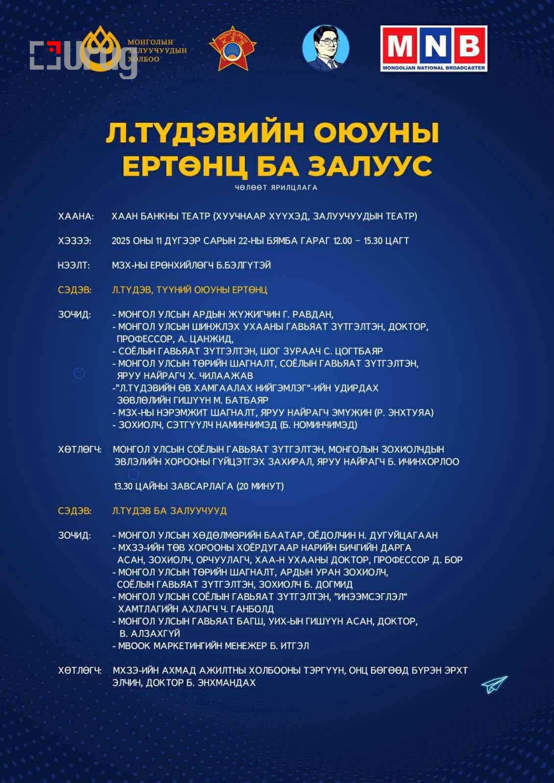 Монголын утга зохиол, сэтгүүл зүй, боловсрол, оюуны ертөнцийн томоохон төлөөлөгч, нэрт соён гэгээрүүлэгч залуучуудын байгууллагын гарамгай удирдагч Лодонгийн Түдэв гуайн 90 насны ойн хүрээнд зохион байгуулагдах Л.ТҮДЭВИЙН ОЮУНЫ ЕРТӨНЦ БА ЗАЛУУС чөлөөт уулзалтанд урьж байна.