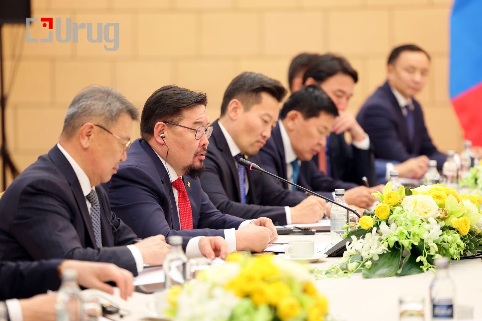 Хоёр улсын хөгжлийн төлөвлөгөө, бүтээн байгуулалтын төлөвлөлтийг харилцан уялдуулахын чухлыг Ерөнхий сайд онцлоод энэ хүрээнд Шивээхүрэн-Сэхээ, Ханги-Мандал, Бичигт-Зүүнхатавч зэрэг боомтын хил дамнасан төмөр замын бүтээн байгуулалтыг үе шаттай урагшлуулахад бэлэн байгааг тодотгов. Түүнчлэн Монгол Улсаас БНХАУ-д экспортлох нүүрсний биет хэмжээг нэмэгдүүлж, 100 сая тоннд хүргэх, хоёр улсын худалдааны бүтцийг төрөлжүүлэх, үүний тулд хөдөө аж ахуйн гаралтай бүтээгдэхүүний хорио цээрийн протоколын тоог нэмэгдүүлэх замаар хоёр талын худалдааны хэмжээг 20 тэрбум ам.долларт хүргэх зорилтыг биелүүлэх санал дэвшүүллээ.