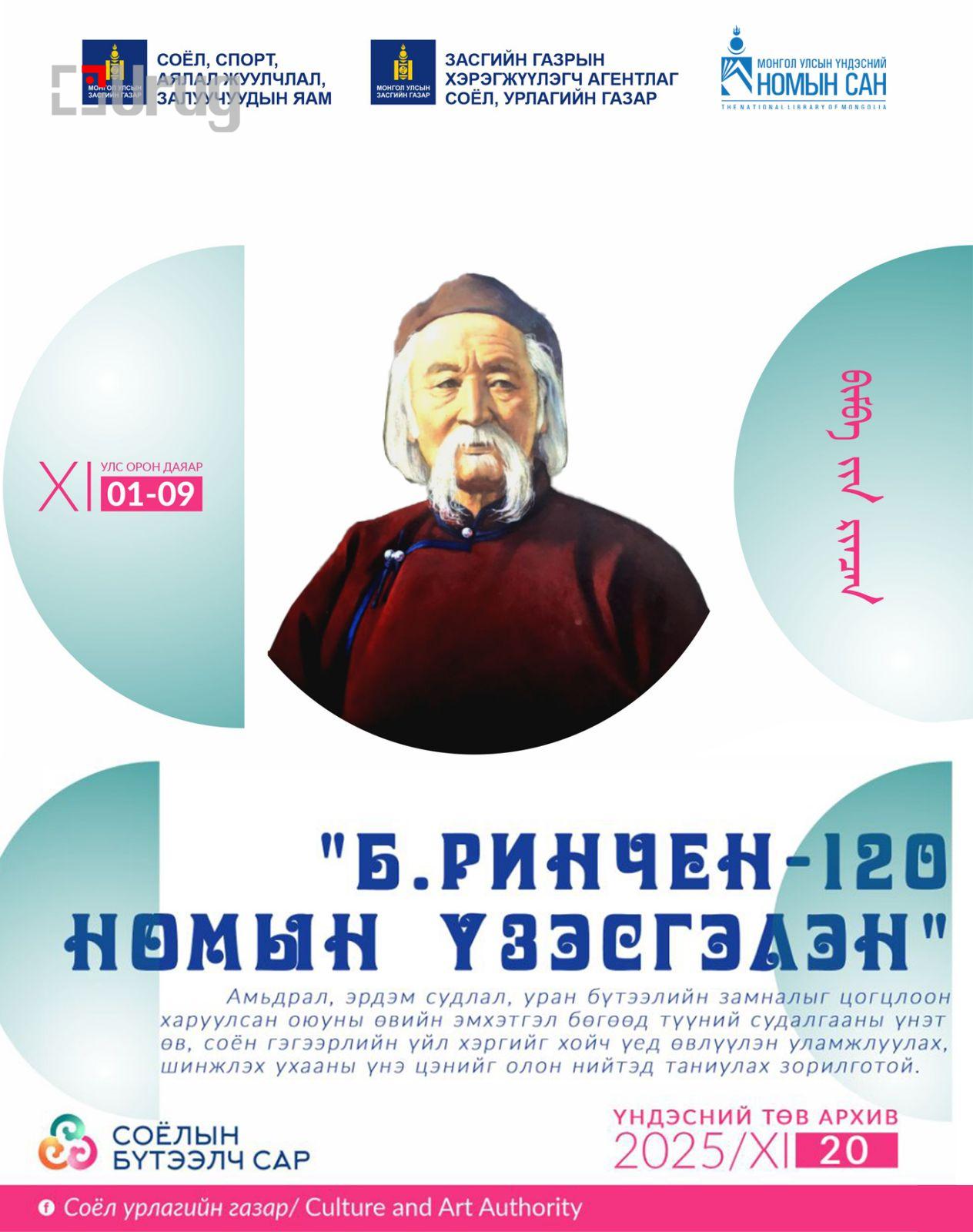 Монгол Улсын Төрийн шагналт, төр, нийгмийн нэрт зүтгэлтэн, академич Бямбын Ринчений мэндэлсний 120 жилийн ойд зориулсан олон улсын эрдэм шинжилгээний хурлыг Соёл, спорт, аялал, жуулчлал, залуучуудын яам, ШУА-ийн Хэл зохиолын хүрээлэн, Архивын Ерөнхий газар, Олон улсын монгол судлалын холбоо хамтран Архивын Ерөнхий газарт зохион байгуулж байна.
