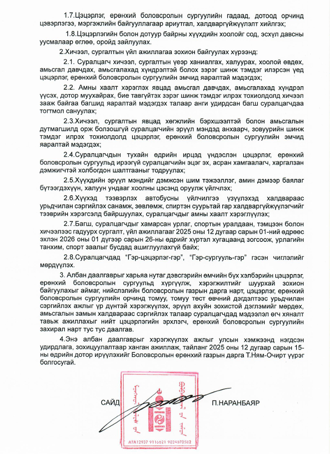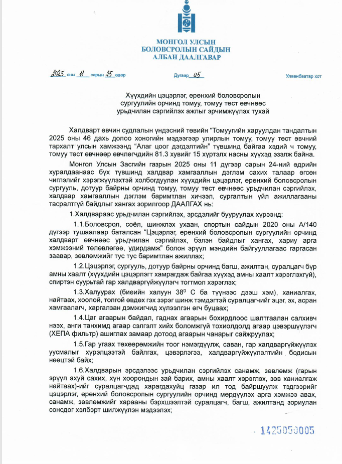 Боловсролын сайд П.Наранбаярын “Хүүхдийн цэцэрлэг, ерөнхий боловсролын сургуулийн орчинд томуу, томуу төст өвчнөөс урьдчилан сэргийлэх ажлыг эрчимжүүлэх ажлыг эрчимжүүлэх тухай” сайдын албан даалгавар гарчээ.