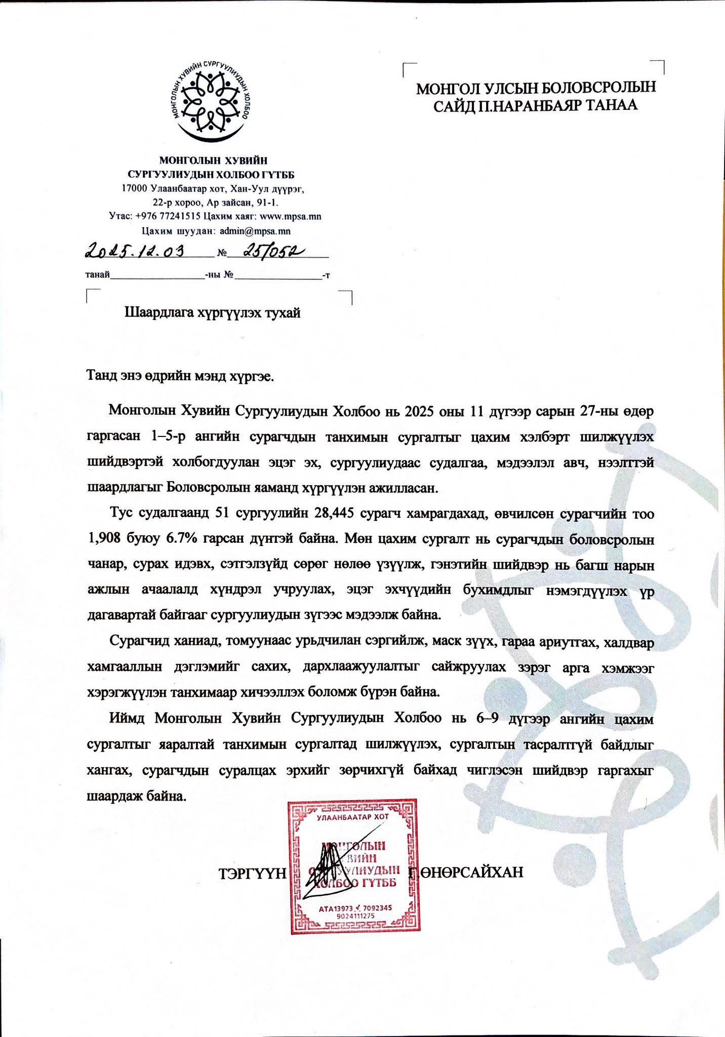 Монголын хувийн сургуулиудын холбооноос Боловсролын сайд П.Наранбаярт 6-9 дүгээр ангийн хүүхдүүдийг танхимаар хичээллүүлэх тухай шаардлага хүргүүлжээ.