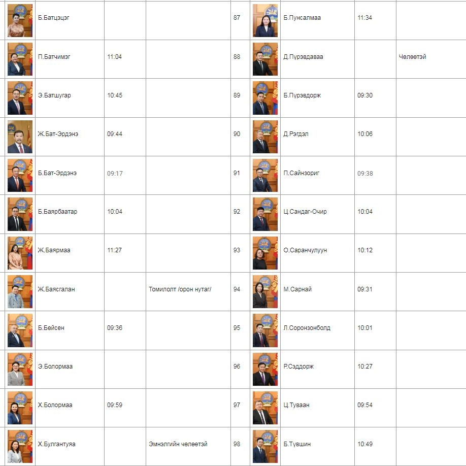 Тэгвэл өнөөдрийн чуулганы хуралдаандаа нийт 126 гишүүний 93 нь ирсэн. 6 гишүүн эмнэлгийн чөлөөтэй, 8 гишүүн гадаад томилолттой байгаа бол 7 гишүүн чөлөөтэй байна. Харин 12 гишүүн чуулганы хуралдаандаа ирээгүй буюу тасалжээ.