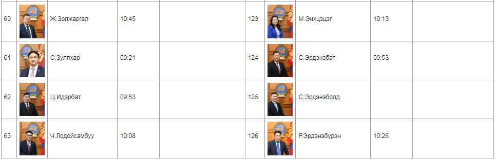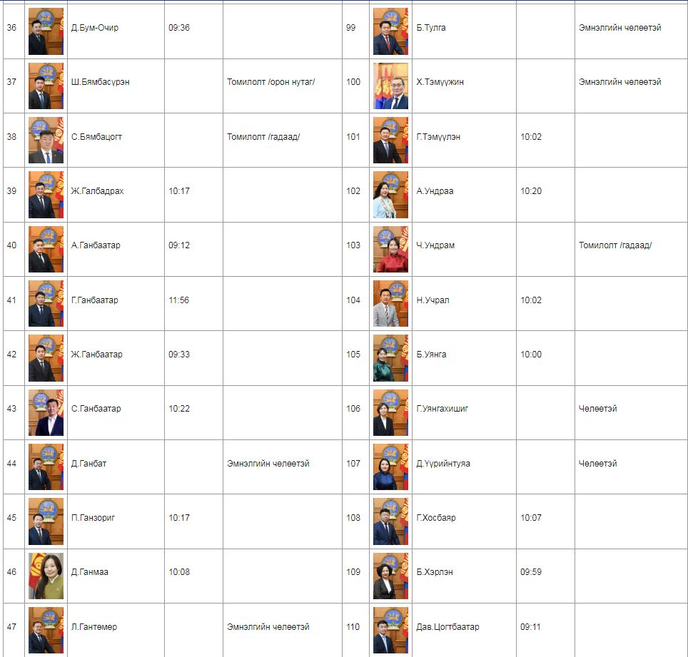 Тэгвэл өнөөдрийн чуулганы хуралдаандаа нийт 126 гишүүний 93 нь ирсэн. 6 гишүүн эмнэлгийн чөлөөтэй, 8 гишүүн гадаад томилолттой байгаа бол 7 гишүүн чөлөөтэй байна. Харин 12 гишүүн чуулганы хуралдаандаа ирээгүй буюу тасалжээ.