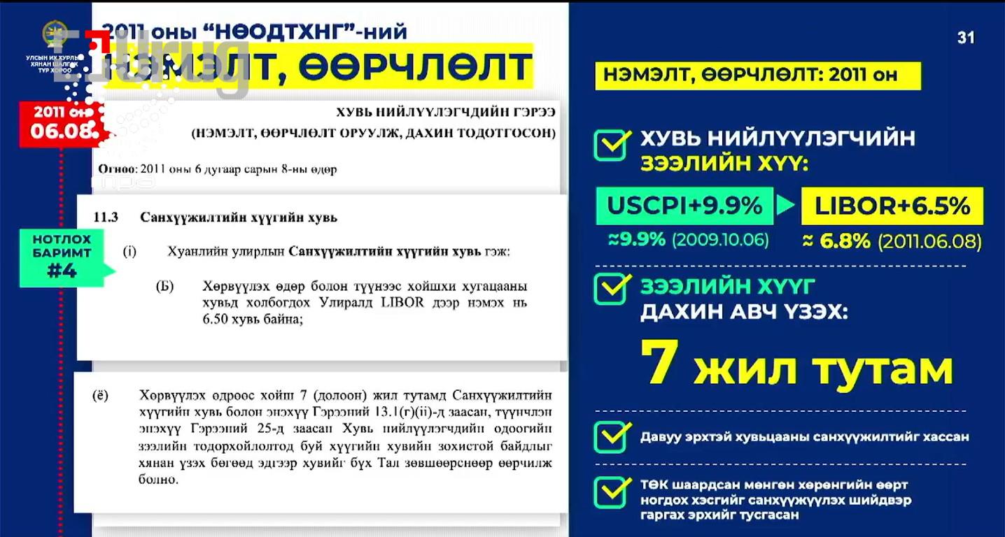 Сая “Оюутолгой”-той хийсэн хэлэлцээрийн хүрээнд тусгай роялтигийн зохицуулалтыг ашиглаж байна. Дараагийн нэг асуудал нь — хүүгийн түвшин өндөр байна. Хоёрдугаарт, менежментийн төлбөр өндөр. Гуравдугаарт, ТЭЗҮ-дээ 53 хувийн өгөөжийг Монгол Улс, 47 хувийг хөрөнгө оруулагч тал авна гэдгийг баталгаажуулах ёстой байсан.