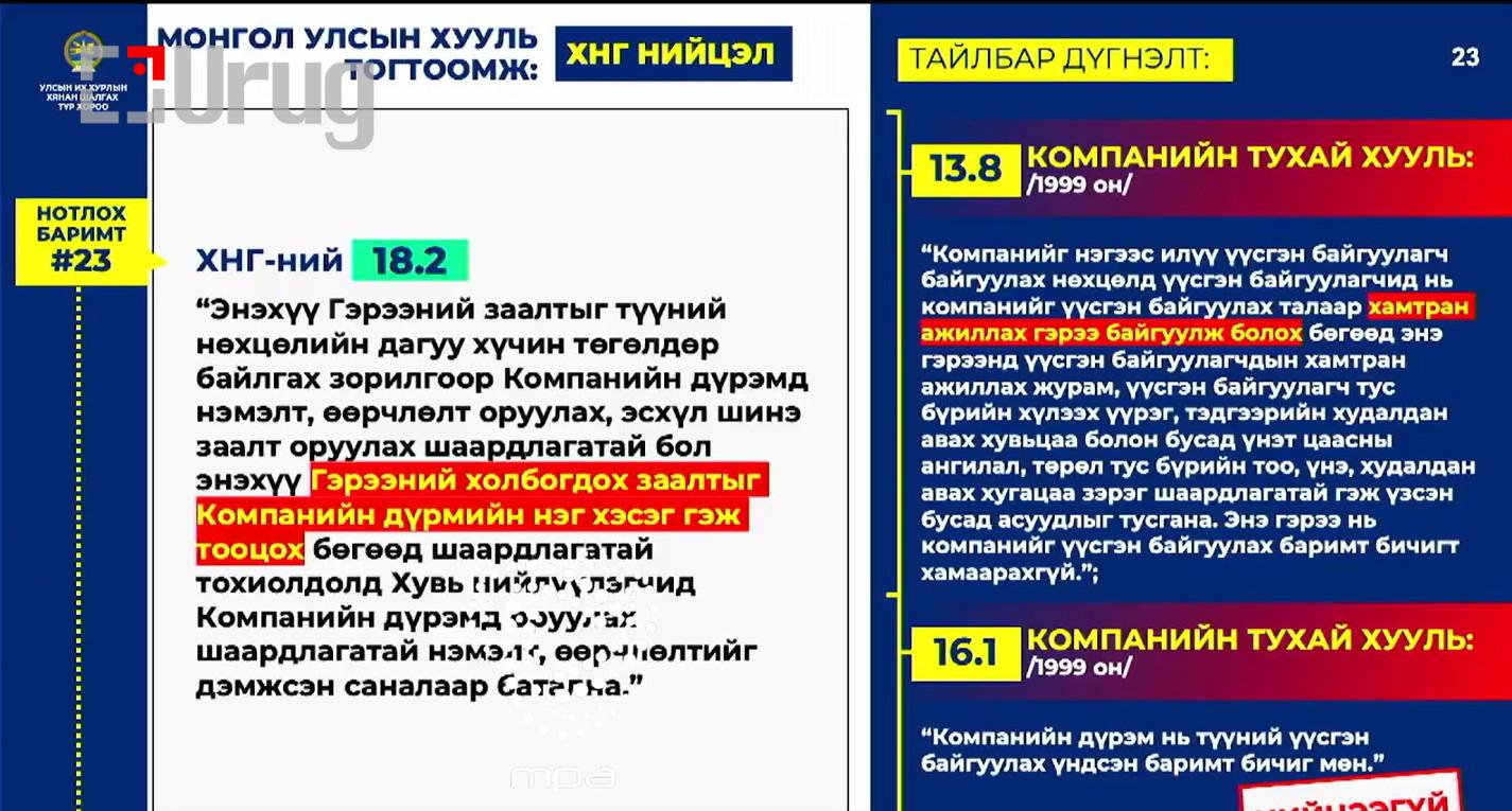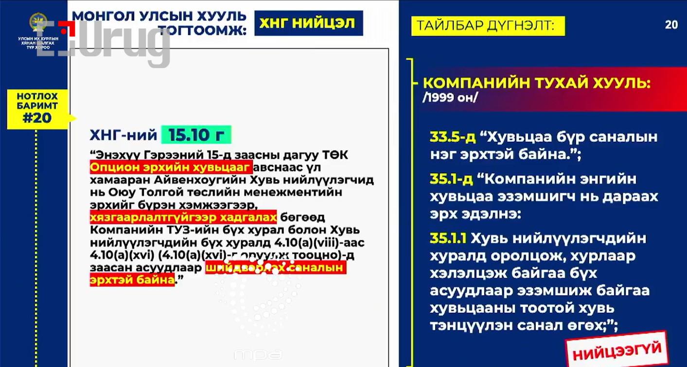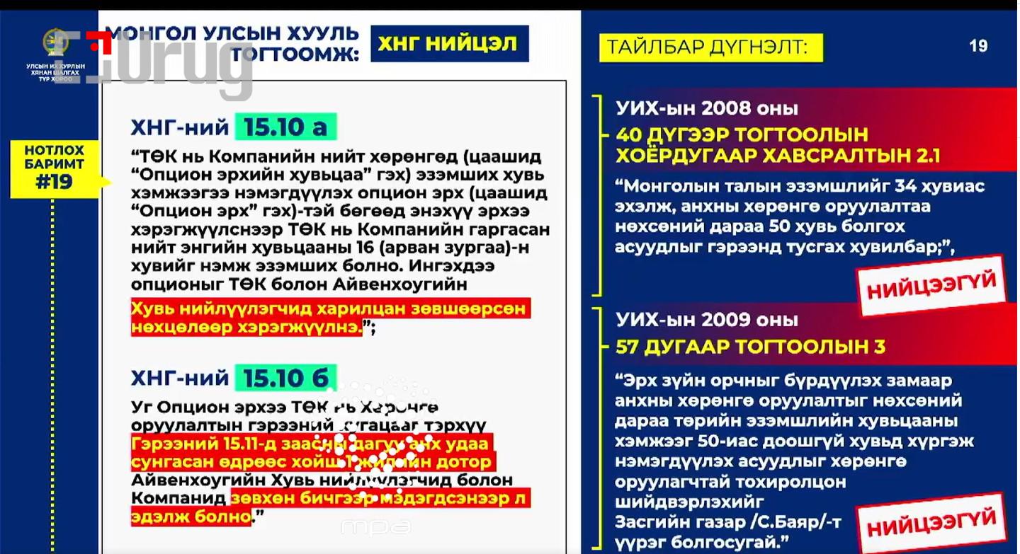 “Сая танилцуулсан баримтуудад таны УИХ-ын чуулганы хуралдаанд хэлсэн үгс харагдаж байна. Монголчууд энэ төслөөс өндөр өгөөж хүлээж байсан. Та чуулганы индэр дээрээс өгөөж хүртэх хувь 55-75 хувь байна гэж хэлсэн. Гэтэл ТЭЗҮ (Техник, эдийн засгийн үндэслэл) батлагдаагүй байхад байгуулсан гэрээнд энэ хувь нь 53 хувь гэж тусгагдсан байдаг. Гэрээ байгуулсан хүний хувьд энэ асуудлыг юу гэж дүгнэж байна вэ?“