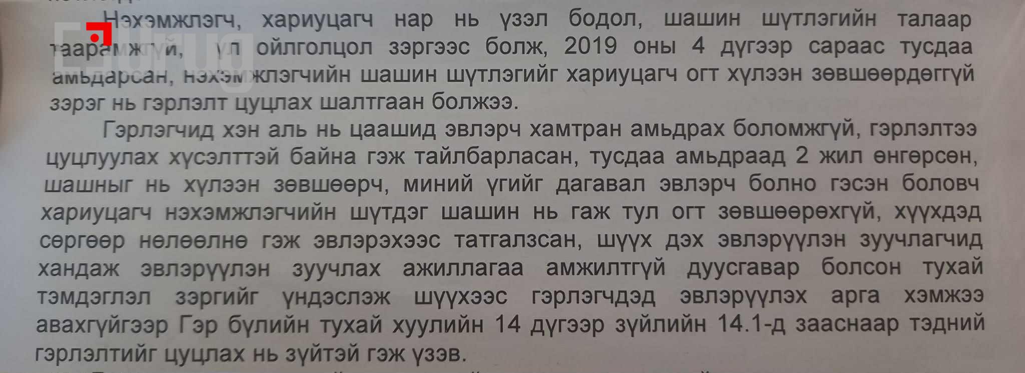 “Гадаадын иргэн, харьяатын газраас мэдээллийн дагуу төлөвлөгөөт бус хяналт шалгалтыг хийлээ. Хяналт шалгалтаар визгүй зорчих нөхцөлийн дагуу орж ирсэн 2 орны 8 иргэн нь “Монгол сувд сүм” шашны байгууллагын үйл ажиллагаанд оролцож, ирсэн зорилгоосоо өөр үйл ажиллагаа явуулж, Гадаадын иргэний эрх зүйн байдлын тухай хууль болон бусад хууль, тогтоомж зөрчсөн нь тогтоогдсон.
