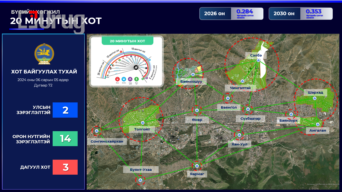 Ингэхдээ ирэх таван жил нийслэл Улаанбаатар хотыг тогтвортой, иргэдийн амьдрах орчныг сайжруулж, хүртээмжтэй, эдийн засгийн өрсөлдөх чадвартай “20 минутын хот” бодлогын хүрээнд бүсчлэн улсын зэрэглэлтэй 2, орон нутгийн зэрэглэлтэй 14, дагуул 2 хот болгон хөгжүүлэхээр төлөвлөжээ. Тухайлбал нийслэлийн ерөнхий боловсролын нийт 150 сургууль байгааг 2030 он хүртэл 84 сургуулиар нэмэгдүүлэх байна. Одоогоор анги бүр 50-иас дээш сурагчтай бөгөөд нийслэлийн хэмжээнд 300 мянган сурагч байгаагаас хүчин чадлын хэтрэлт 150 мянга гарчээ. Тиймээс 84 сургууль шинээр барьснаар 25 сурагчаар буурах байна. Тэгвэл эрүүл мэндийн салбарт нийслэлийн хэмжээнд ажиллаж буй 1,2,3 шатлалын нийт 216 эмнэлгийн үйлчилгээ, хүртээмжийг нэмэгдүүлж эрт илрүүлэг, товлолт вакцины хамрах хүрээг нэмэгдүүлэх байна. Нийслэлд 1.7 сая хүн амтай. Үүний 1.1 сая нь хөдөлмөрийн насных бөгөөд үүнээс 627 мянга гаруй буюу 55 хувь нь хөдөлмөр эрхэлж байна. Тэгвэл 2030 он гэхэд ажиллах хүчний оролцох түвшнийг 0.642 байгааг 0.650 болгож нэмэгдүүлэх байна. Нийтийн тээврийн бодлогыг шинэчилж нийтийн тээврийн зорчилтыг нэмэгдүүлэх, авто замын томоохон бүтээн байгуулалтыг өрнүүлж нийт 191км зам тавих байна. Одоогоор нийслэлд 1 хүнд ногдох ногоон байгууламж 6.5мкв байгаа бол үүнийг 9мкв болгон нэмэгдүүлэх болон бусад төлөвлөлтүүдийг нь салбар, бүсчлэлээр нь хийсэн гэдгийг онцоллоо.