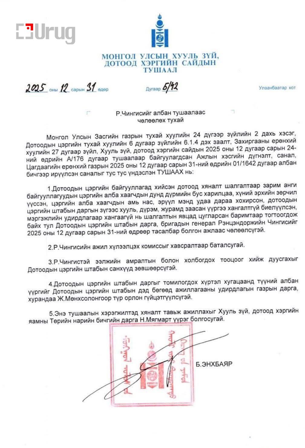 Тэгвэл Хууль зүй, дотоод хэргийн сайд Б.Энхбаярын тушаалаар Дотоодын цэргийн штабын дарга, Бригадын генерал Р.Чингисийг үүрэгт ажлаас нь чөлөөлөх шийдвэр гарчээ.