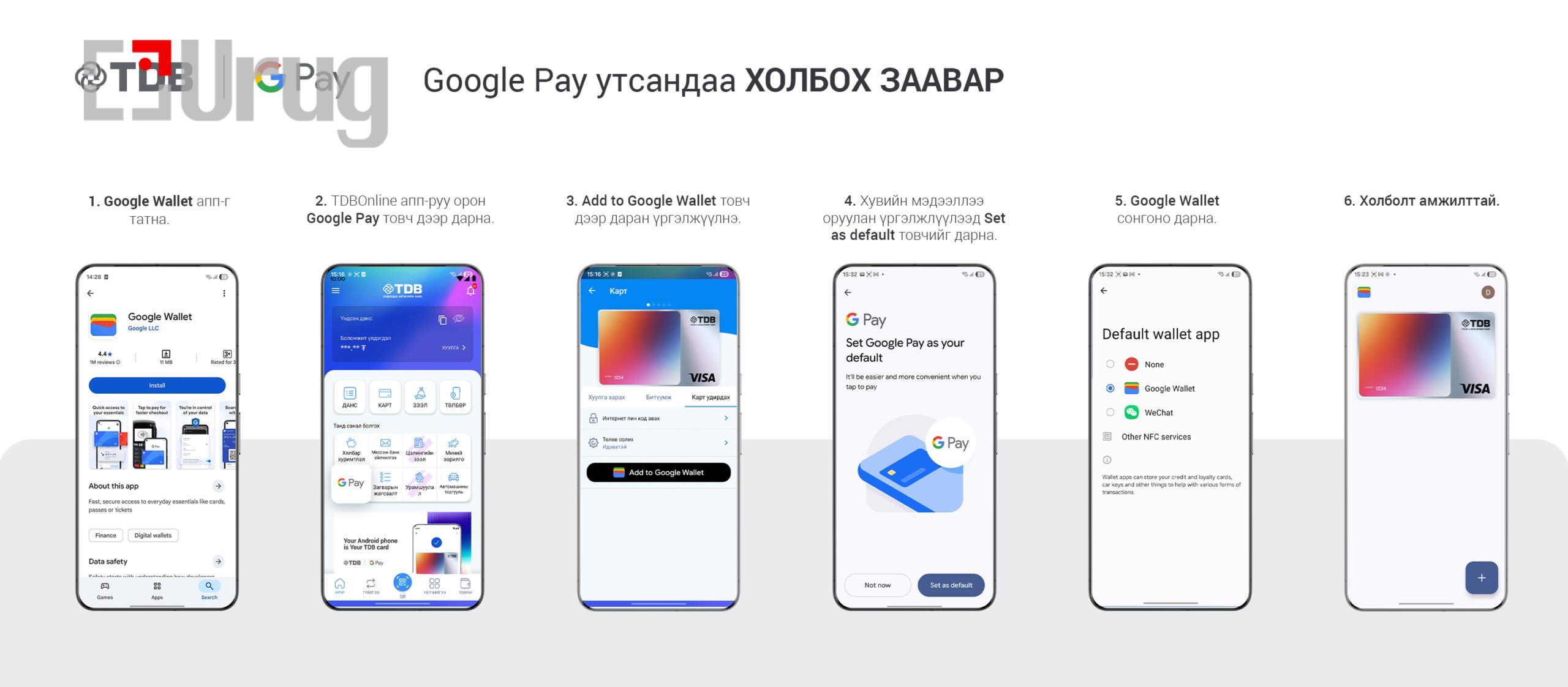 Харилцагч та Google Wallet апп татаад, ХХБ-ны TDB Online эсвэл Happy Pay aпп-руу орж Google Pay цэсээр хялбархан холбогдоорой.