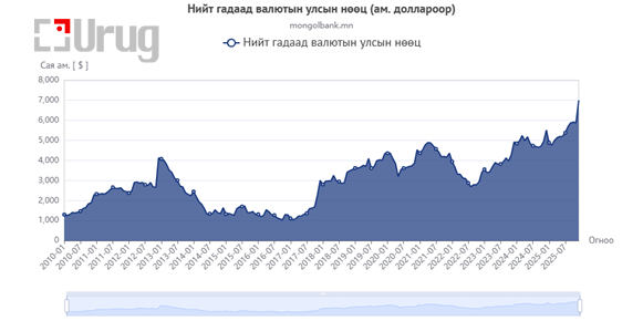 Монгол Улсын гадаад валютын нөөцийн хэмжээ 2025 оны жилийн эцсийн гүйцэтгэлээр 7 тэрбум ам.долларт хүрч, оны эхнээс 1.5 тэрбум ам.доллар буюу 27.1%-иар нэмэгдлээ.