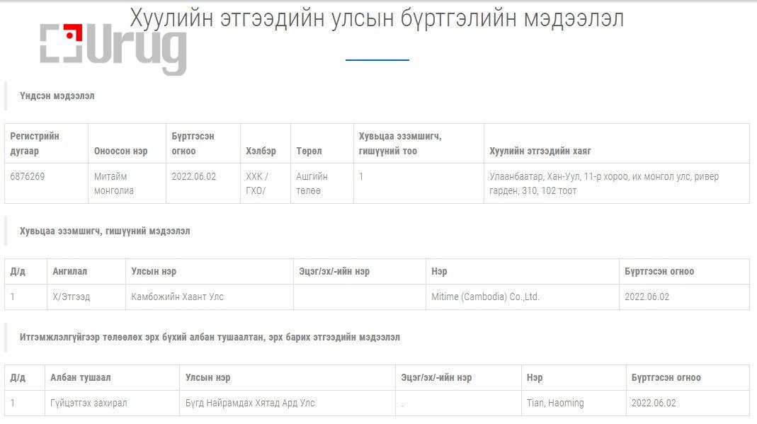 Тодруулан хэлбэл, “Митайм интернэйшнл” ХХК нь 2018 онд байгуулагдсан. Монгол Улсад “Митайм Монголиа” нэрээр үйл ажиллагаагаа явуулдаг. Тус компани Монгол Улсад үйл ажиллагаа явуулахаар 2022 оны зургадугаар сард бүртгүүлсэн бөгөөд гүйцэтгэх захирлаар нь БНХАУ-ын иргэн Тиан Хао Мин, компанийн эцсийн өмчлөгч нь БНХАУ-ын иргэн Жао Жиэ бүртгэлтэй байгааг дараах баримтаас харж байна.