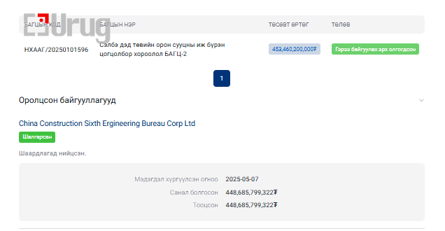 - Багц-2 буюу 453 тэрбум төгрөгийн өртөг бүхий тендерт “China Construction Sixth Ergineering Bureau Corp Ltd