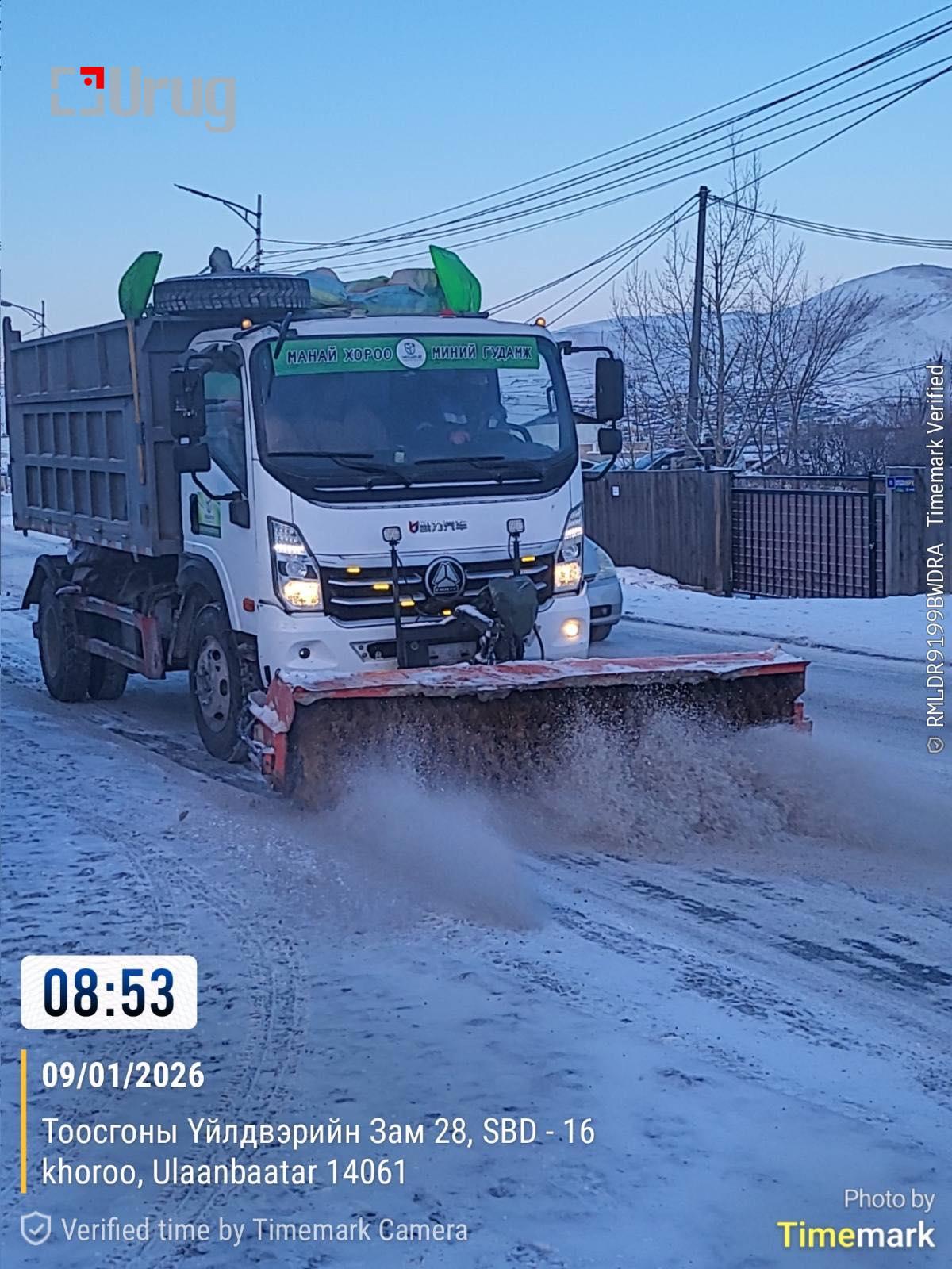 2026 оны нэгдүгээр сарын 09-ны өдөр Сүхбаатар дүүргийн хэмжээнд зам талбайн цэвэрлэгээг дөрвөн байгууллагын, 145 ажилтан албан хаагч хийж байна. Гудамж талбайн цэвэрлэгээнд тусгай бодис цацагч техник 4, автозам болон замын нуух шүүрдэгч техник 4, ковш 2, бобкат зэрэг төхөөрөмжүүдийг ашиглаж байна. Дүүргийн хэмжээнд 624 тонн давс, 654.7 тонн бодисын нөөцтэй байгаа юм.