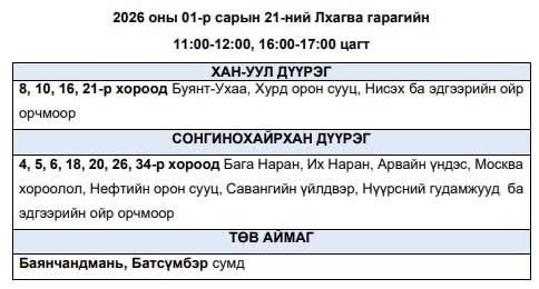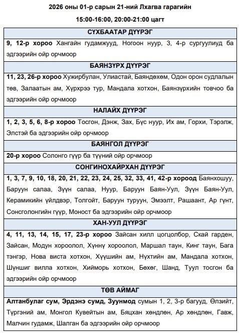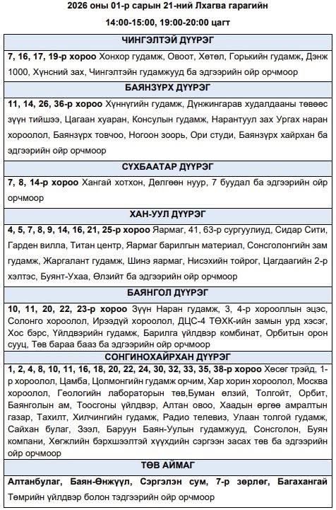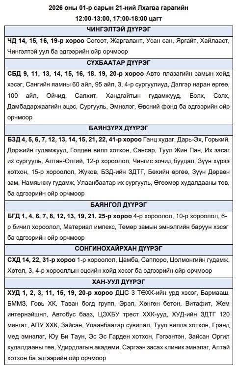 Энэ хүрээнд, эрчим хүчний чадлын дутагдлаас шалтгаалан 2026 оны нэгдүгээр сарын 21-ний өдөр буюу өнөөдөр дараах байршлуудад цахилгаан хязгаарлалт хийж болзошгүй талаар Улаанбаатар цахилгаан түгээх сүлжээ ТӨХК-аас мэдээллээ.