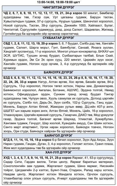 Эрчим хүчний системд аваарын горим үүсэхээс сэргийлэн нийслэлийн хэмжээнд тодорхой байршлуудад цахилгаан эрчим хүчний төлөвлөсөн хэрэглээг “Диспетчерийн үндэсний төв” ТӨХХК-ийн шийдвэрээр хуваарийн дагуу нэгээс нэг цаг гучин минутын хугацаатайгаар хязгаарлах арга хэмжээ авч буй.