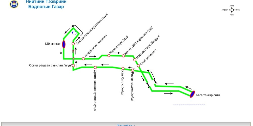 - Ч:84 “Бага тэнгэр сити-Хан хиллс хотхон-120 мянгат” чиглэлийн нийтийн тээврийн автобус зогсох юм.